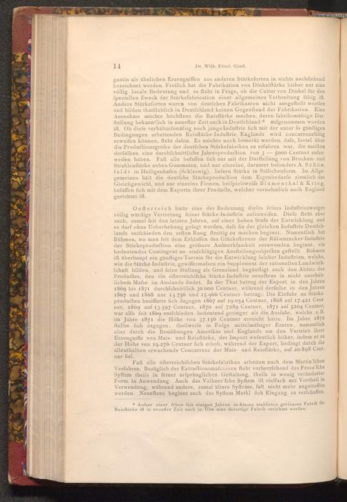 gantin als ähnlichen Erzeugniffen aus anderen Stärkeforten in nichts nachstehend bezeichnet werden. Freilich hat die Fabrikation von Dinkelftärke bisher nur eine völlig locale Bedeutung und es fteht in Frage, ob die Cultur von Dinkel für den speciellen Zweck der Stärkefabrication einer allgemeinen Verbreitung fähig ift. Andere Stärkeforten waren von deutſchen Fabrikanten nicht ausgeftellt worden und bilden thatfächlich in Deutſchland keinen Gegenftand der Fabrikation. Eine Ausnahme möchte höchftens die Reisftärke machen, deren fabriksmässige Darftellung bekanntlich in neuefter Zeit auch in Deutſchland* aufgenommen worden ift. Ob diefe verhältnifsmäfsig noch junge Induſtrie fich mit der unter fo günftigen Bedingungen arbeitenden Reisftärke- Induftrie. Englands wird concurrenzfähig erweifen können, fteht dahin. Es möchte noch bemerkt werden, dafs, foviel über die Productionsgröfse der deutfchen Stärkefabriken zu erfahren war, die meiften derfelben eine durchfchnittliche Jahresproduction von 35000 Centner aufzuweifen haben. Faft alle befaffen fich nur mit der Darftellung von Brocken- und Strahlenftärke neben Gummaten, und nur einzelne, darunter befonders A. Schönfeldt in Heiligenhafen( Schleswig), liefern Stärke in Stäbchenform. Im Allgegemeinen hält die deutfche Stärkeproduction dem Eigenbedarfe ziemlich das Gleichgewicht, und nur einzelne Firmen, beifpielsweife Blumenthal& Krieg, befaffen fich mit dem Exporte ihrer Producte, welcher vornehmlich nach England gerichtet ift.