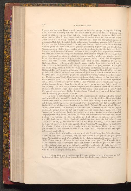 Proben von Amidon, Dextrin und Leogomme find durchwegs vorzügliche Erzeugniffe, die auch in Bezug auf Preis mit den beften Fabrikaten anderer Firmen concurriren können. In der That hat die genannte Firma in diefen Artikeln auch einen bedeutenden Export, zumal nach Deutfchland aufzuweifen. Die zweite Firma, Jofef Nowak in Prag, welche in neuefter Zeit auch die Stärkefabrikation in gröfserem Mafsftabe betreibt, hatte neben einer bemerkenswerthen Collection von Farblacken für Schafwolldruck, in welchem Artikel diefelbe fich einen wohlverdienten guten Ruf erworben hat, gleichfalls muftergiltige Proben von künftlichen Gummaten ausgeftellt. Unter diefen möchte befonders der für die Appretur feiner Leinen und Baumwoll- Waaren beftimmte Glanzapprêt hervorgehoben werden, welcher, aus einer Mifchung von mehreren Stärkeforten dargestellt, durch Kochen unter Hochdruck zu einer blendend weifsen gummöfen Maffe umgewandelt werden kann, die eine glatte und glänzende Appretur liefert. Auch das Kunftgummi, fowie ein fehr fchönes Patentgummi und endlich eine prächtige Probe von Kaftanienftärke verdienten alle Anerkennung. Ausserdem hatten auch Kern& Lindauer in Waldmühle bei Liefing, David Bloch in Jungbunzlau, S. Engelmann in Prag, Franz Eduard Wonka in Křinec in Böhmen und R. Löhnertin Böhmifch- Leipa Proben von Dextrin, Amidon, Gommelin, Druckkleifter etc. ausgeftellt Producte, von welchen namentlich jene von Kern& Lindauer, fowie jene von David Bloch als durchwegs gute zu bezeichnen waren, während die Erzeugniffe der Uebrigen zum Theile Manches zu wünſchen übrig liefsen. Erwähnt möchte noch werden, dafs Dr. G. Thenius in Wiener- Neuftadt als befondere Specialität ein Cellulofe Dextrin ausgeftellt hatte, deffen Qualität eine vorwurfsfreie war. Ob diefes Erzeugnifs mit dem bereits 1819 von Braconnot und später auch von Béchamp, Payen und Anderen dargestellten Holzdextrin identifch ift und etwa auch auf ähnlichem Wege gewonnen werden kann, oder aber ein neues Product ift, war nicht zu eruiren. Bisher ſcheint diefer Artikel übrigens noch keine befondere Bedeutung gewonnen zu haben.