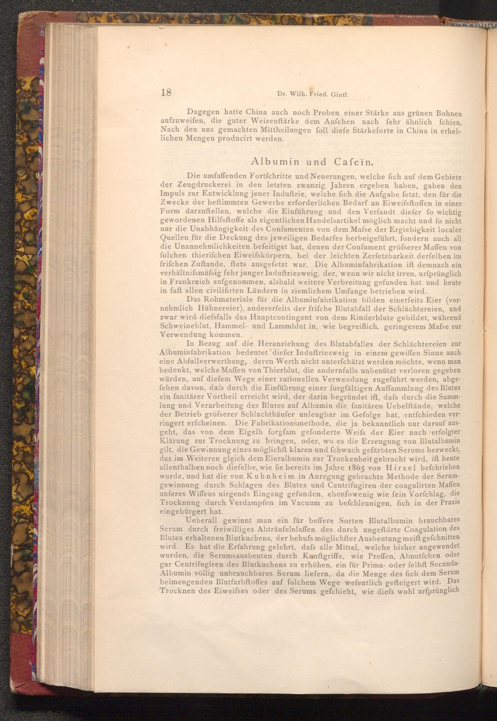 Die umfaffenden Fortfchritte und Neuerungen, welche fich auf dem Gebiete der Zeugdruckerei in den letzten zwanzig Jahren ergeben haben, gaben den Impuls zur Entwicklung jener Induftrie, welche fich die Aufgabe fetzt, den für die Zwecke der beftimmten Gewerbe erforderlichen Bedarf an Eiweifsftoffen in einer Form darzuftellen, welche die Einführung und den Verfandt diefer fo wichtig gewordenen Hilfsftoffe als eigentlichen Handelsartikel möglich macht und fo nicht nur die Unabhängigkeit des Confumenten von dem Mafse der Ergiebigkeit localer Quellen für die Deckung des jeweiligen Bedarfes herbeigeführt, fondern auch all die Unannehmlichkeiten befeitiget hat, denen der Confument gröfserer Maffen von folchen thierifchen Eiweifskörpern, bei der leichten Zerfetzbarkeit derfelben im frifchen Zuſtande, ftets ausgefetzt war. Die Albuminfabrikation ift demnach ein verhältnifsmäfsig fehr junger Induftriezweig, der, wenn wir nicht irren, ursprünglich in Frankreich aufgenommen, alsbald weitere Verbreitung gefunden hat und heute in faft allen civilifirten Ländern in ziemlichem Umfange betrieben wird.