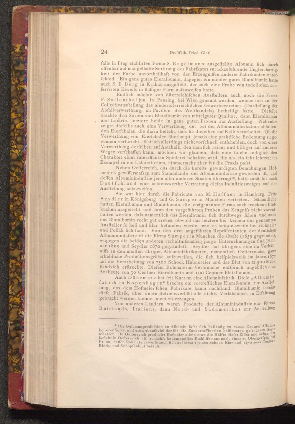 Sie war hier durch die Fabricate von M. Häffner in Hamburg, Fritz Seydler in Königsberg und G. Sumper in München vertreten. Sämmtliche hatten Eieralbumin und Blutalbumin, die letztgenannte Firma auch trockene Blutkuchen ausgeftellt, und kann den vorgeführten Proben das Zeugnifs nicht vorenthalten werden, dafs namentlich das Eieralbumin fich durchwegs fchön und auch das Blutalbumin recht gut erwies, obwohl das letztere bei keinem der genannten Ausfteller fo hell und klar befunden wurde, wie es beiſpielsweife bei Hofmeier und Pollak fich fand. Von den drei angeführten Repräfentanten der deutſchen Albumininduftrie ift die Firma Sumper in München die ältefte( 1859 gegründet), wogegen die beiden anderen verhältnifsmässig junge Unternehmungen find( Häffner 1869 und Seydler 1870 gegründet). Seydler hat übrigens eine im Verhältniffe zu den meiften übrigen Albuminfabrikanten, namentlich Oefterreichs, ganz erhebliche Productionsgröfse aufzuweifen, die fich beifpielsweife im Jahre 1872 auf die Verarbeitung von 7500 Schock Hühnereier und das Blut von 12.500 Stück Rindvieh erftreckte. Diefem Rohmaterial- Verbrauche entſprach angeblich eine Ausbeute von 30 Centner Eieralbumin und 100 Centner Blutalbumin.