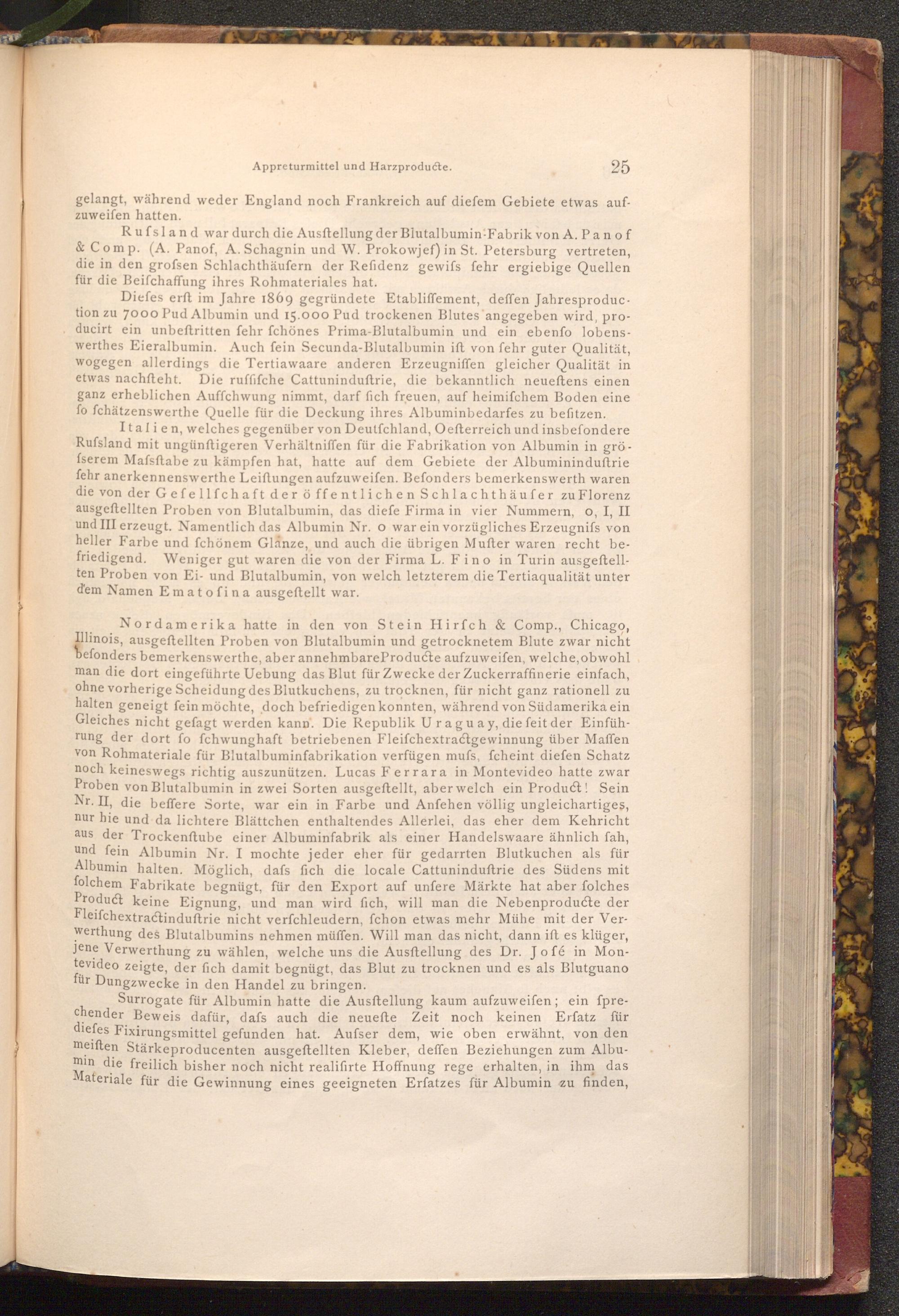 Rufsland war durch die Ausftellung der Blutalbumin- Fabrik von A. Panof & Comp.( A. Panof, A. Schagnin und W. Prokowjef) in St. Petersburg vertreten, die in den grofsen Schlachthäufern der Refidenz gewifs fehr ergiebige Quellen für die Beifchaffung ihres Rohmateriales hat.