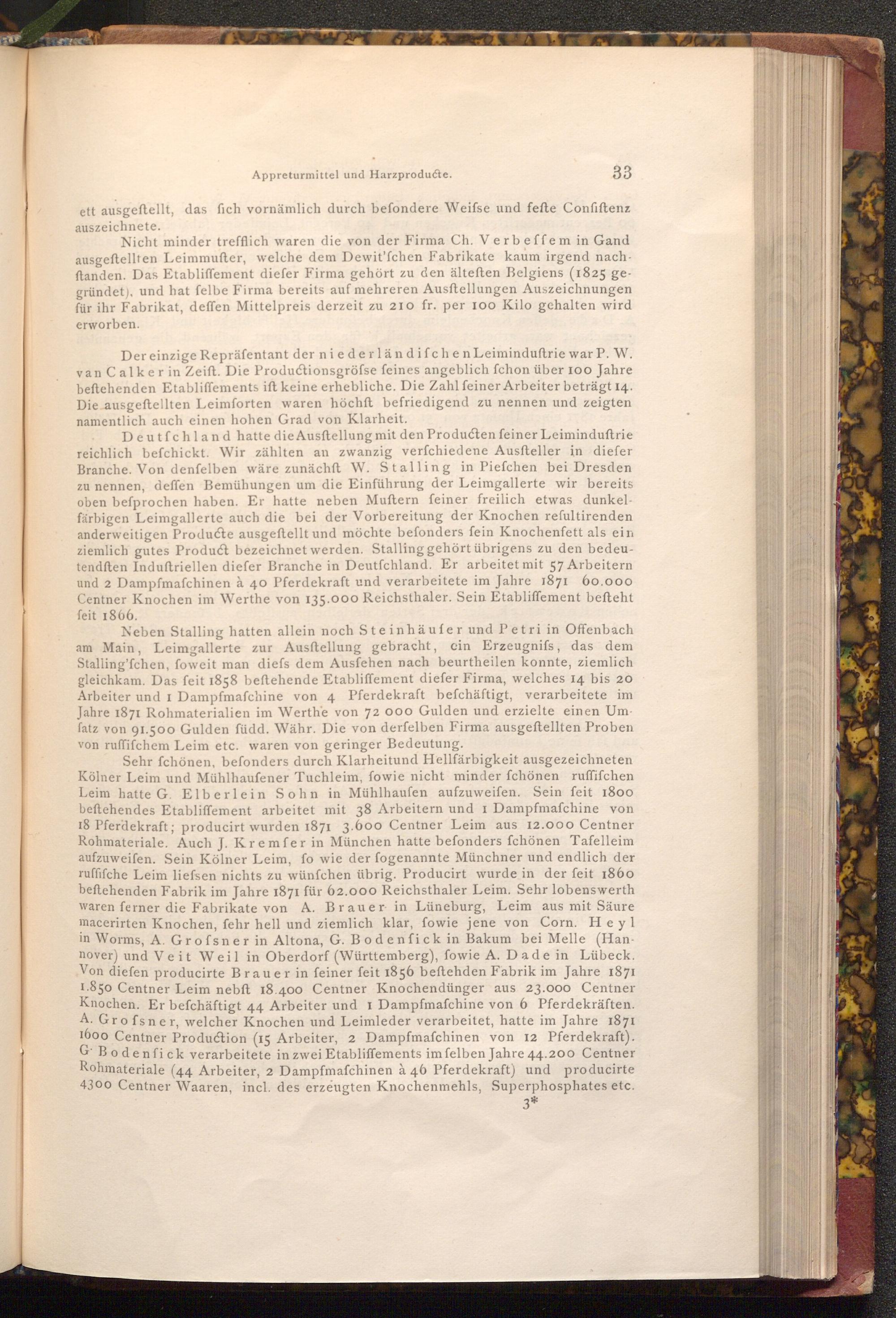 Neben Stalling hatten allein noch Steinhäufer und Petri in Offenbach am Main, Leimgallerte zur Ausftellung gebracht, ein Erzeugnifs, das dem Stalling'fchen, foweit man diefs dem Ausfehen nach beurtheilen konnte, ziemlich gleichkam. Das feit 1858 beftehende Etabliffement diefer Firma, welches 14 bis 20 Arbeiter und 1 Dampfmafchine von 4 Pferdekraft befchäftigt, verarbeitete im Jahre 1871 Rohmaterialien im Werthe von 72 000 Gulden und erzielte einen Umfatz von 91.500 Gulden füdd. Währ. Die von derfelben Firma ausgeftellten Proben von ruffifchem Leim etc. waren von geringer Bedeutung.