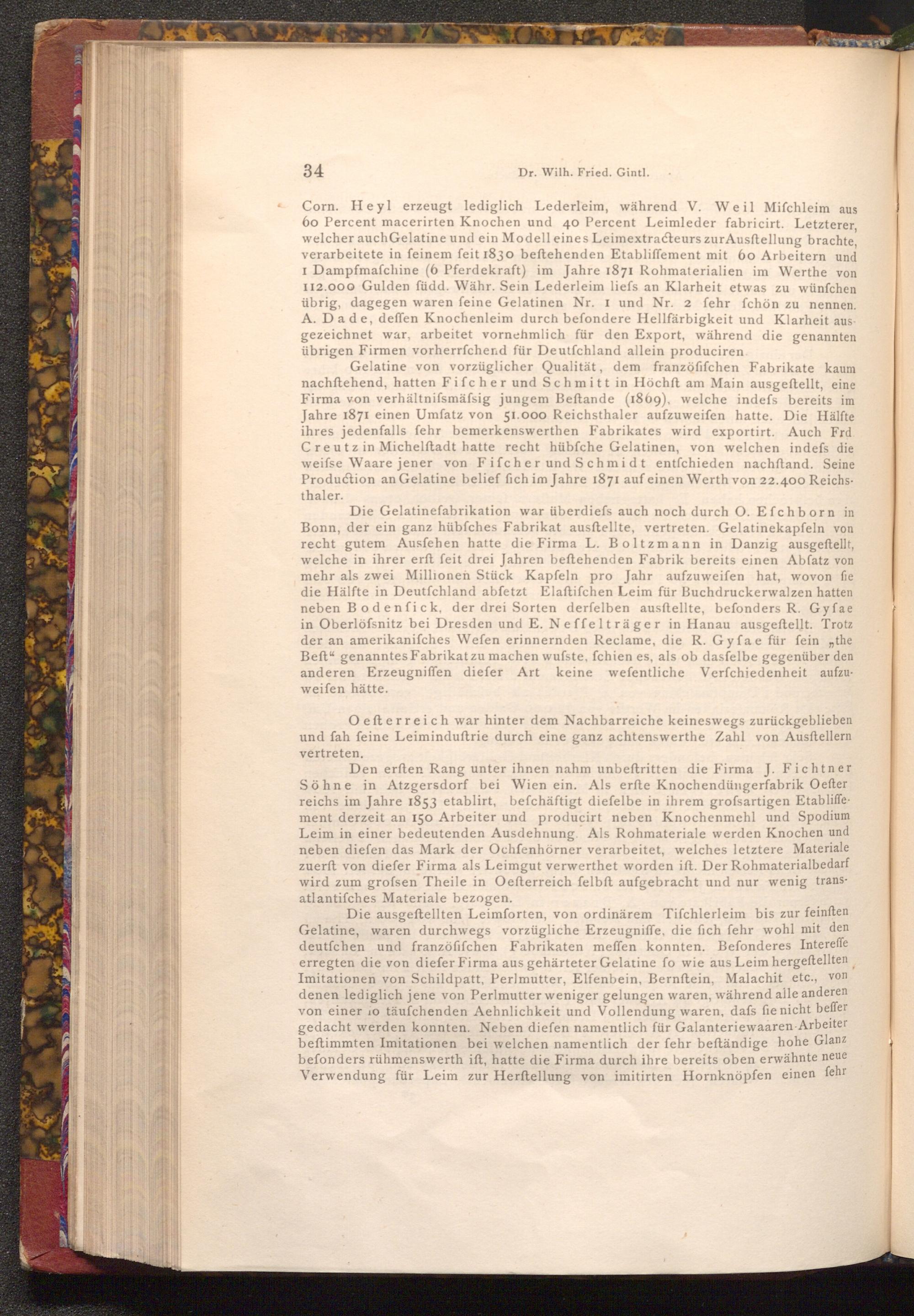 Den erften Rang unter ihnen nahm unbeftritten die Firma J. Fichtner Söhne in Atzgersdorf bei Wien ein. Als erfte Knochendüngerfabrik Oefter reichs im Jahre 1853 etablirt, befchäftigt diefelbe in ihrem grofsartigen Etabliffe. ment derzeit an 150 Arbeiter und producirt neben Knochenmehl und Spodium Leim in einer bedeutenden Ausdehnung. Als Rohmateriale werden Knochen und neben diefen das Mark der Ochfenhörner verarbeitet, welches letztere Materiale zuerft von diefer Firma als Leimgut verwerthet worden ift. Der Rohmaterialbedarf wird zum grofsen Theile in Oefterreich felbft aufgebracht und nur wenig transatlantifches Materiale bezogen.