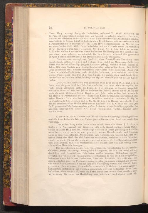 Corn. Heyl erzeugt lediglich Lederleim, während V. Weil Mifchleim aus 60 Percent macerirten Knochen und 40 Percent Leimleder fabricirt. Letzterer, welcher auch Gelatine und ein Modell eines Leimextracteurs zur Ausftellung brachte, verarbeitete in feinem feit 1830 beftehenden Etabliffement mit 60 Arbeitern und I Dampfmaschine( 6 Pferdekraft) im Jahre 1871 Rohmaterialien im Werthe von 112.000 Gulden füdd. Währ. Sein Lederleim liefs an Klarheit etwas zu wünſchen übrig, dagegen waren feine Gelatinen Nr. I und Nr. 2 fehr fchön zu nennen. A. Dade, deffen Knochenleim durch befondere Hellfärbigkeit und Klarheit ausgezeichnet war, arbeitet vornehmlich für den Export, während die genannten übrigen Firmen vorherrfchend für Deutſchland allein produciren