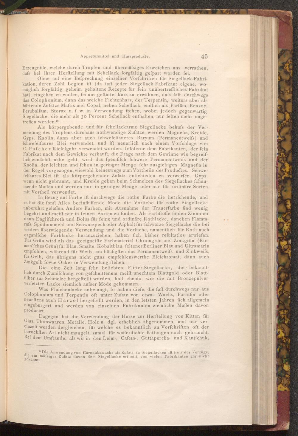 Ohne auf eine Befprechung einzelner Vorfchriften für Siegellack- Fabrikation, deren Zahl Legion ift( da faft jeder Siegellack Fabrikant eigene, womöglich forgfältig geheim gehaltene Recepte für fein unübertreffliches Fabrikat hat), eingehen zu wollen, fei uns geftattet kurz zu erwähnen, dafs faft durchwegs das Colophonium, dann das weiche Fichtenharz, der Terpentin, weiters aber als härtende Zufätze Maftix und Copal, neben Schellack, endlich als Parfüm, Benzoe, Perubalfam, Storax u. f. w. in Verwendung ftehen, wobei jedoch gegenwärtig Siegellacke, die mehr als 30 Percent Schellack enthalten, nur felten mehr angetroffen werden.*