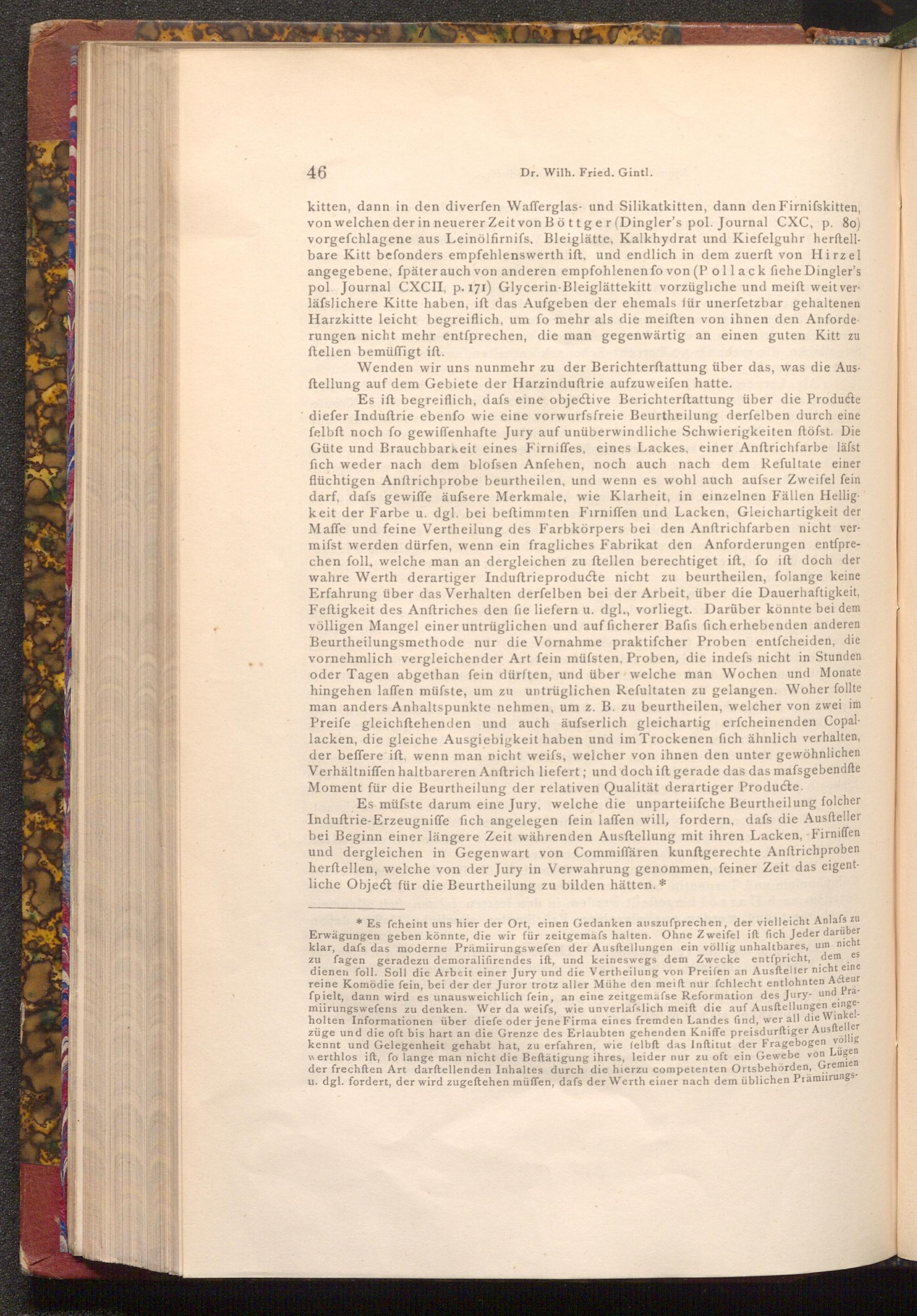 Es ift begreiflich, dafs eine objective Berichterftattung über die Producte diefer Induftrie ebenfo wie eine vorwurfs freie Beurtheilung derfelben durch eine felbft noch fo gewiffenhafte Jury auf unüberwindliche Schwierigkeiten ftöfst. Die Güte und Brauchbarkeit eines Firniffes, eines Lackes, einer Anftrichfarbe läfst fich weder nach dem blofsen Anfehen, noch auch nach dem Refultate einer flüchtigen Anftrichprobe beurtheilen, und wenn es wohl auch aufser Zweifel fein darf, dafs gewiffe äufsere Merkmale, wie Klarheit, in einzelnen Fällen Hellig. keit der Farbe u. dgl. bei beſtimmten Firniffen und Lacken, Gleichartigkeit der Maffe und feine Vertheilung des Farbkörpers bei den Anftrichfarben nicht vermisst werden dürfen, wenn ein fragliches Fabrikat den Anforderungen entſprechen foll, welche man an dergleichen zu ftellen berechtiget ift, fo ift doch der wahre Werth derartiger Induftrieproducte nicht zu beurtheilen, folange keine Erfahrung über das Verhalten derfelben bei der Arbeit, über die Dauerhaftigkeit, Feftigkeit des Anftriches den fie liefern u. dgl., vorliegt. Darüber könnte bei dem völligen Mangel einer untrüglichen und auf ficherer Bafis fich erhebenden anderen Beurtheilungsmethode nur die Vornahme praktifcher Proben entfcheiden, die vornehmlich vergleichender Art fein müfsten, Proben, die indefs nicht in Stunden oder Tagen abgethan fein dürften, und über welche man Wochen und Monate hingehen laffen müfste, um zu untrüglichen Refultaten zu gelangen. Woher follte man anders Anhaltspunkte nehmen, um z. B. zu beurtheilen, welcher von zwei im Preife gleichftehenden und auch äufserlich gleichartig erfcheinenden Copallacken, die gleiche Ausgiebigkeit haben und im Trockenen fich ähnlich verhalten, der beffere ift, wenn man nicht weifs, welcher von ihnen den unter gewöhnlichen Verhältniffen haltbareren Anftrich liefert; und doch ift gerade das das mafsgebendfte Moment für die Beurtheilung der relativen Qualität derartiger Producte.