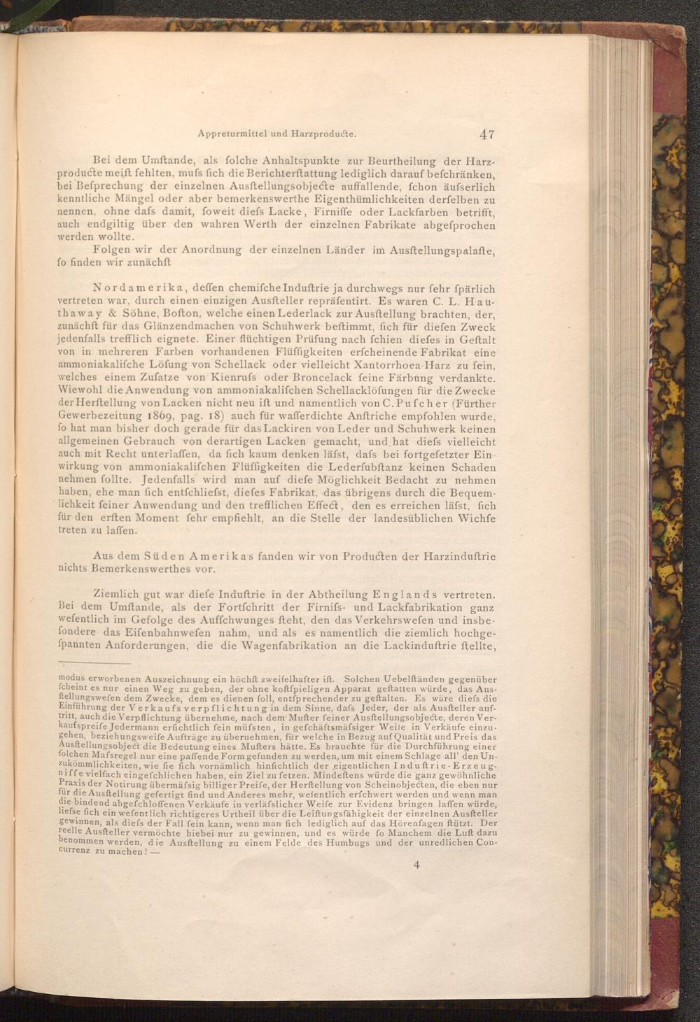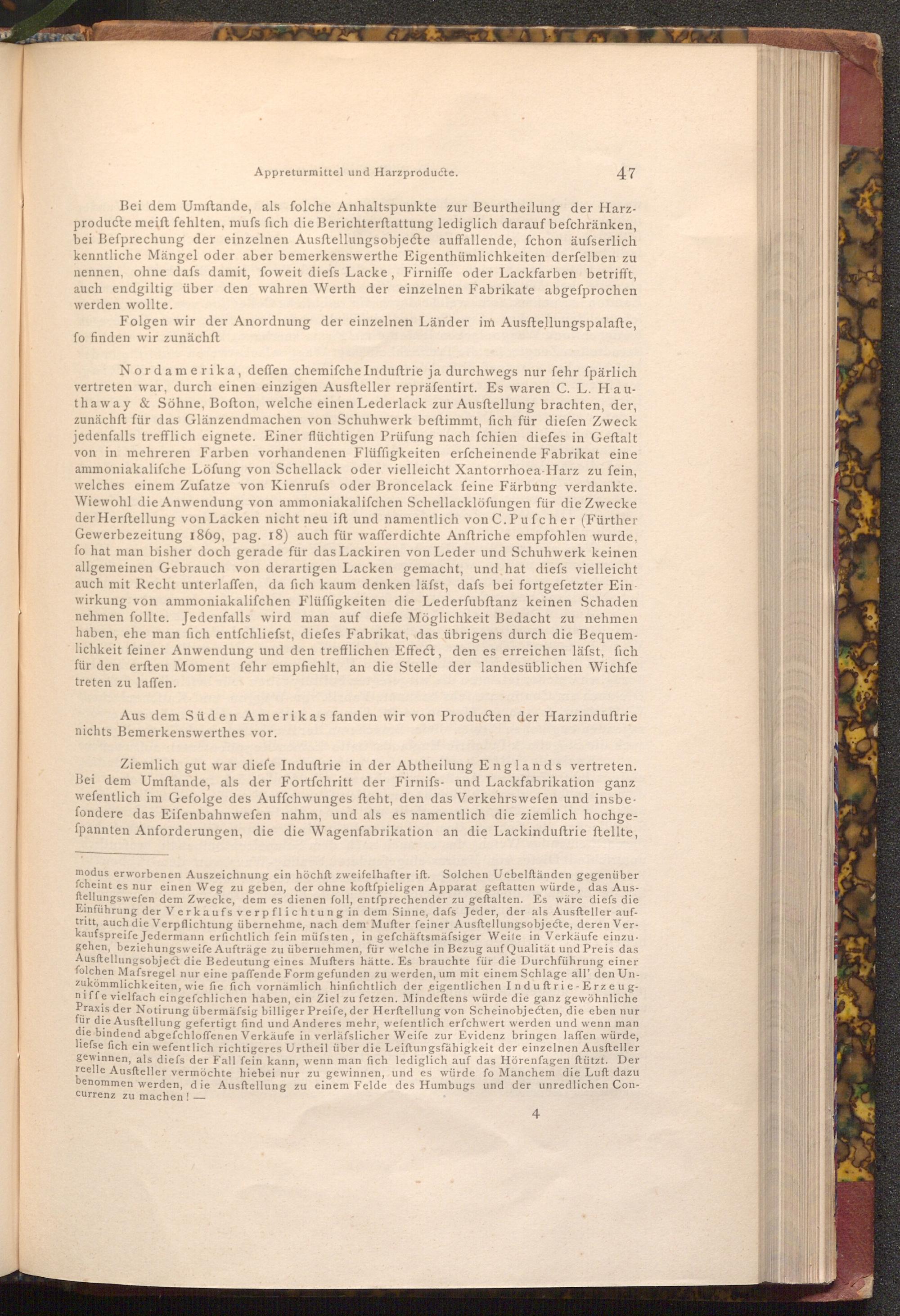 Bei dem Umftande, als folche Anhaltspunkte zur Beurtheilung der Harzproducte meift fehlten, mufs fich die Berichterstattung lediglich darauf befchränken, bei Besprechung der einzelnen Ausftellungsobjecte auffallende, fchon äufserlich kenntliche Mängel oder aber bemerkenswerthe Eigenthümlichkeiten derfelben zu nennen, ohne dafs damit, foweit diefs Lacke, Firniffe oder Lackfarben betrifft, auch endgiltig über den wahren Werth der einzelnen Fabrikate abgefprochen werden wollte.