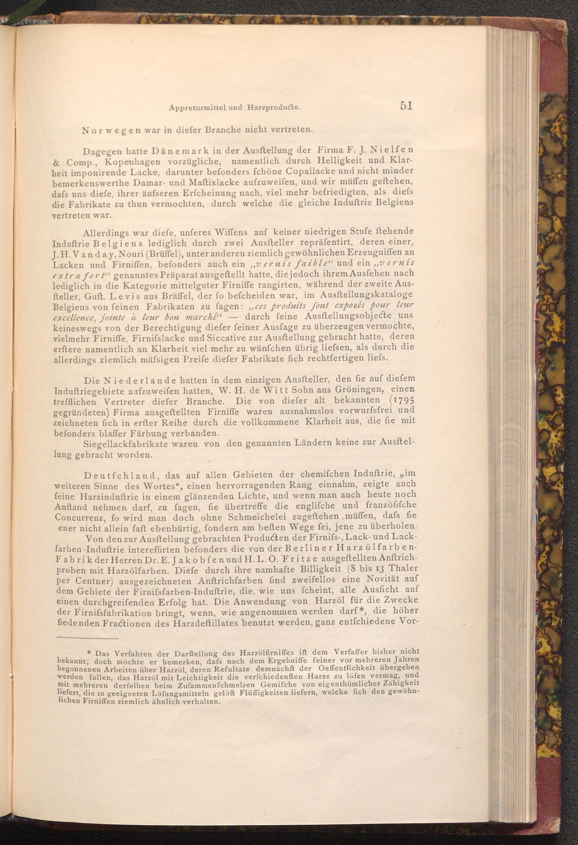 Die Niederlande hatten in dem einzigen Ausfteller, den fie auf diefem Induftriegebiete aufzuweifen hatten, W. H. de Witt Sohn aus Gröningen, einen trefflichen Vertreter diefer Branche. Die von diefer alt bekannten( 1795 gegründeten) Firma ausgeftellten Firniffe waren ausnahmslos vorwurfsfrei und zeichneten fich in erfter Reihe durch die vollkommene Klarheit aus, die fie mit befonders blaffer Färbung verbanden.