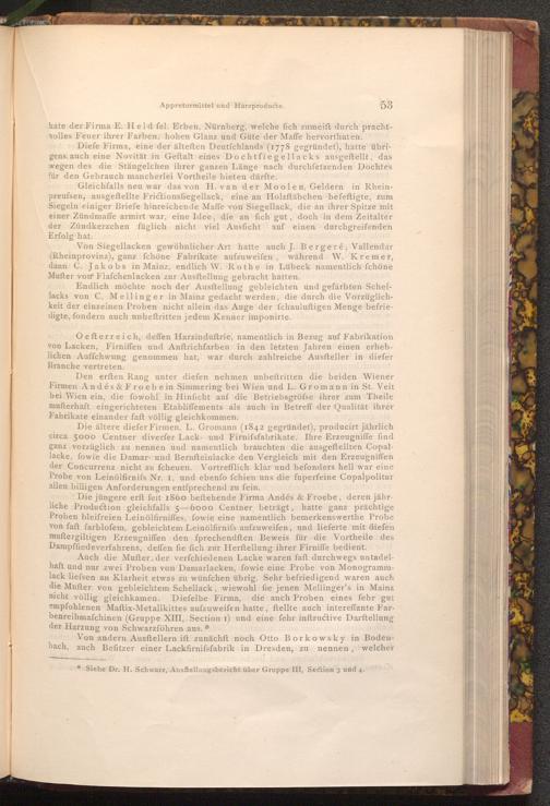 Die ältere diefer Firmen, L. Gromann( 1842 gegründet), producirt jährlich circa 5000 Centner diverfer Lack- und Firnifsfabrikate. Ihre Erzeugniffe find ganz vorzüglich zu nennen und namentlich brauchten die ausgeftellten Copallacke, fowie die Damar- und Bernfteinlacke den Vergleich mit den Erzeugniffen der Concurrenz nicht zu fcheuen. Vortrefflich klar und befonders hell war eine Probe von Leinölfirnifs Nr. I, und ebenfo fchien uns die fuperfeine Copalpolitur allen billigen Anforderungen entsprechend zu fein. diablos sib miodol bas ods Die jüngere erft feit 1860 beftehende Firma Andés& Froebe, deren jährliche Production gleichfalls 5-6000 Centner beträgt, hatte ganz prächtige Proben bleifreien Leinölfirniffes, fowie eine namentlich bemerkenswerthe Probe von faft farblofem, gebleichtem Leinölfirnifs aufzuweifen, und lieferte mit diefen muftergiltigen Erzeugniffen den fprechendften Beweis für die Vortheile des Dampffied everfahrens, deffen fie fich zur Herftellung ihrer Firniffe bedient.dl