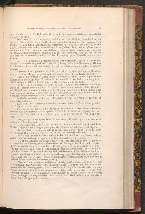 Die Firma D. Hollenbach, welche zu den älteften ihres Faches auf hiefigem Platze zählt, hatte in ftilvollen, nach Entwürfen der hervorragendften Künftler gearbeiteten Gegenftänden, befonders in Luftern, Candelabern, Uhren u. f. w., die mit den beften franzöfifchen Erzeugniffen diefer Art verglichen wer den konnten, fehr Schönes zur Ausstellung geliefert. Diefe Firma erwarb fich um die Wiener Bronzeinduftrie dadurch ein grofses Verdienft, dafs fie feit Jahren eminente Kräfte nutzbar machte und für Erlangung guter Modelle keine Opfer fcheute.