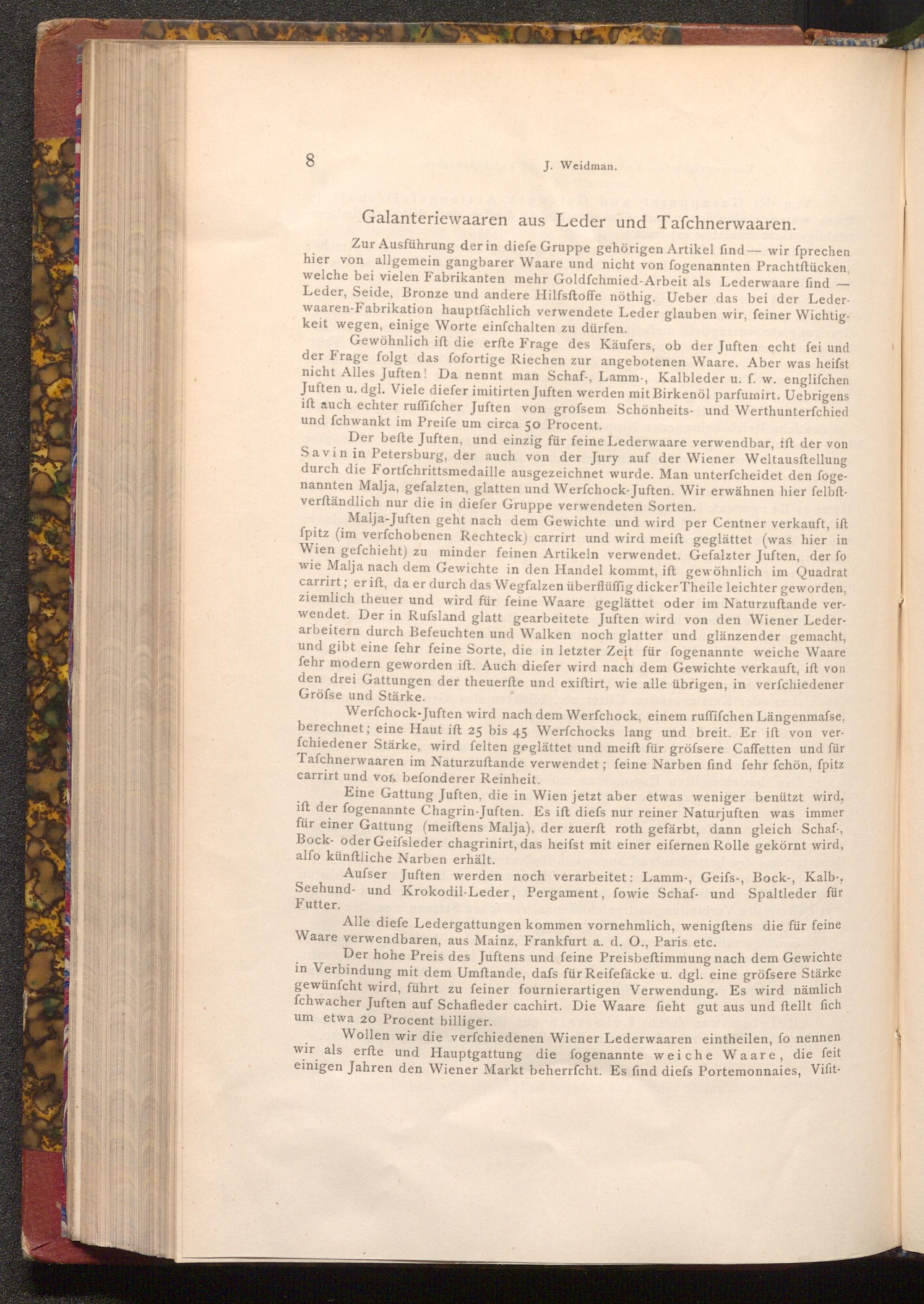 Zur Ausführung der in diefe Gruppe gehörigen Artikel find wir fprechen hier von allgemein gangbarer Waare und nicht von fogenannten Prachtftücken, welche bei vielen Fabrikanten mehr Goldfchmied- Arbeit als Lederwaare find- Leder, Seide, Bronze und andere Hilfsftoffe nöthig. Ueber das bei der Lederwaaren- Fabrikation hauptfächlich verwendete Leder glauben wir, feiner Wichtig. keit wegen, einige Worte einfchalten zu dürfen.