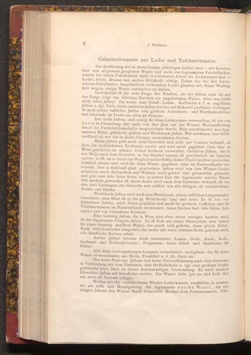 Malja- Juften geht nach dem Gewichte und wird per Centner verkauft, ift fpitz( im verfchobenen Rechteck) carrirt und wird meift geglättet( was hier in Wien gefchieht) zu minder feinen Artikeln verwendet. Gefalzter Juften, der fo wie Malja nach dem Gewichte in den Handel kommt, ift gewöhnlich im Quadrat carrirt; erift, da er durch das Wegfalzen überflüffig dicker Theile leichter geworden, ziemlich theuer und wird für feine Waare geglättet oder im Naturzuftande verwendet. Der in Rufsland glatt gearbeitete Juften wird von den Wiener Lederarbeitern durch Befeuchten und Walken noch glatter und glänzender gemacht, und gibt eine fehr feine Sorte, die in letzter Zeit für fogenannte weiche Waare fehr modern geworden ift. Auch diefer wird nach dem Gewichte verkauft, ift von den drei Gattungen der theuerfte und exiftirt, wie alle übrigen, in verfchiedener Gröfse und Stärke.