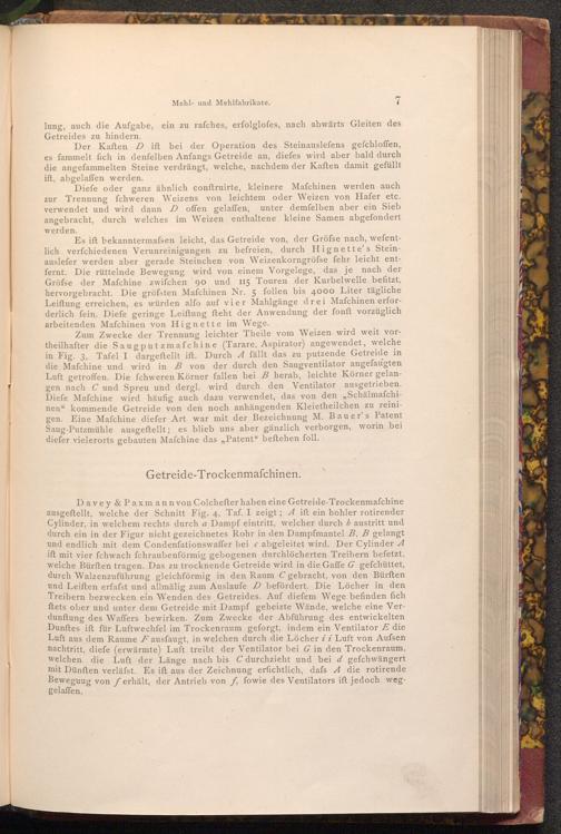 Diefe oder ganz ähnlich conftruirte, kleinere Mafchinen werden auch zur Trennung fchweren Weizens von leichtem oder Weizen von Hafer etc. verwendet und wird dann D offen gelaffen, unter demfelben aber ein Sieb angebracht, durch welches im Weizen enthaltene kleine Samen abgefondert werden.