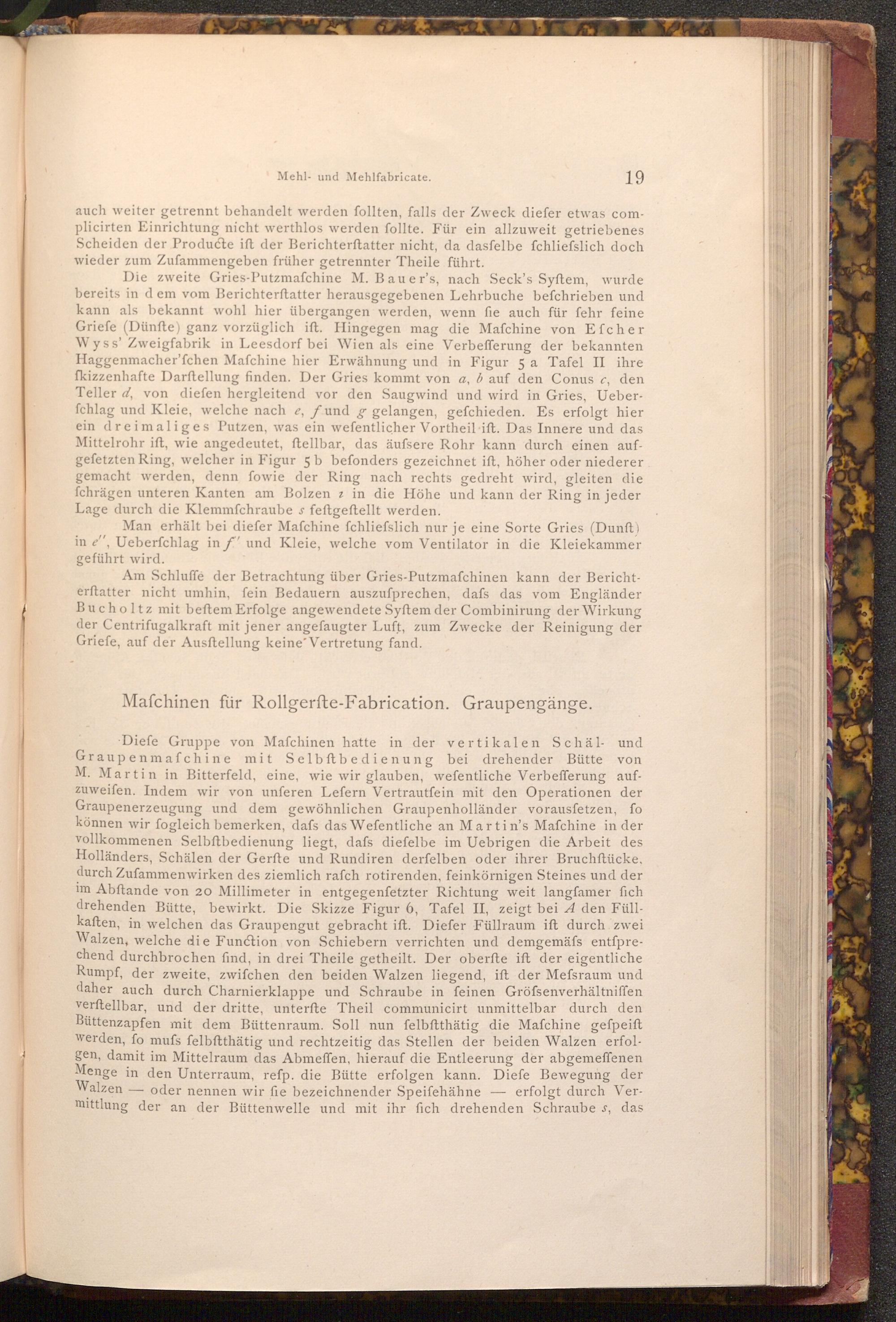 Diefe Gruppe von Maſchinen hatte in der vertikalen Schäl- und Graupenmafchine mit Selbstbedienung bei drehender Bütte M. Martin in Bitterfeld, eine, wie wir glauben, wefentliche Verbefferung aufzuweifen. Indem wir von unferen Lefern Vertrautfein mit den Operationen der Graupenerzeugung und dem gewöhnlichen Graupenholländer vorausfetzen, fo können wir fogleich bemerken, dafs das Wefentliche an Martin's Mafchine in der vollkommenen Selbftbedienung liegt, dafs diefelbe im Uebrigen die Arbeit des Holländers, Schälen der Gerfte und Rundiren derfelben oder ihrer Bruchftücke, durch Zufammenwirken des ziemlich rafch rotirenden, feinkörnigen Steines und der im Abftande von 20 Millimeter in entgegenfetzter Richtung weit langfamer fich drehenden Bütte, bewirkt. Die Skizze Figur 6, Tafel II, zeigt bei A den Füllkaften, in welchen das Graupengut gebracht ift. Diefer Füllraum ift durch zwei Walzen, welche die Function von Schiebern verrichten und demgemäfs entſprechend durchbrochen find, in drei Theile getheilt. Der oberfte ift der eigentliche Rumpf, der zweite, zwifchen den beiden Walzen liegend, ift der Mefsraum und daher auch durch Charnierklappe und Schraube in feinen Gröfsenverhältniffen verftellbar, und der dritte, unterfte Theil communicirt unmittelbar durch den Büttenzapfen mit dem Büttenraum. Soll nun felbftthätig die Mafchine gefpeift werden, fo mufs felbftthätig und rechtzeitig das Stellen der beiden Walzen erfolgen, damit im Mittelraum das Abmeffen, hierauf die Entleerung der abgemeffenen Menge in den Unterraum, refp. die Bütte erfolgen kann. Diefe Bewegung der Walzen oder nennen wir fie bezeichnender Speifehähne erfolgt durch Vermittlung der an der Büttenwelle und mit ihr fich drehenden Schraube s, das