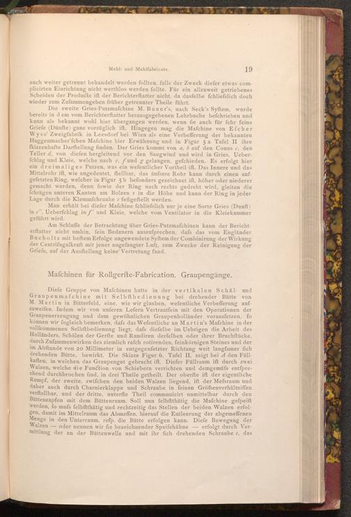 Am Schluffe der Betrachtung über Gries- Putzmafchinen kann der Berichterftatter nicht umhin, fein Bedauern auszufprechen, dafs das vom Engländer Bucholtz mit beftem Erfolge angewendete Syftem der Combinirung der Wirkung der Centrifugalkraft mit jener angefaugter Luft, zum Zwecke der Reinigung der Griefe, auf der Ausftellung keine Vertretung fand.