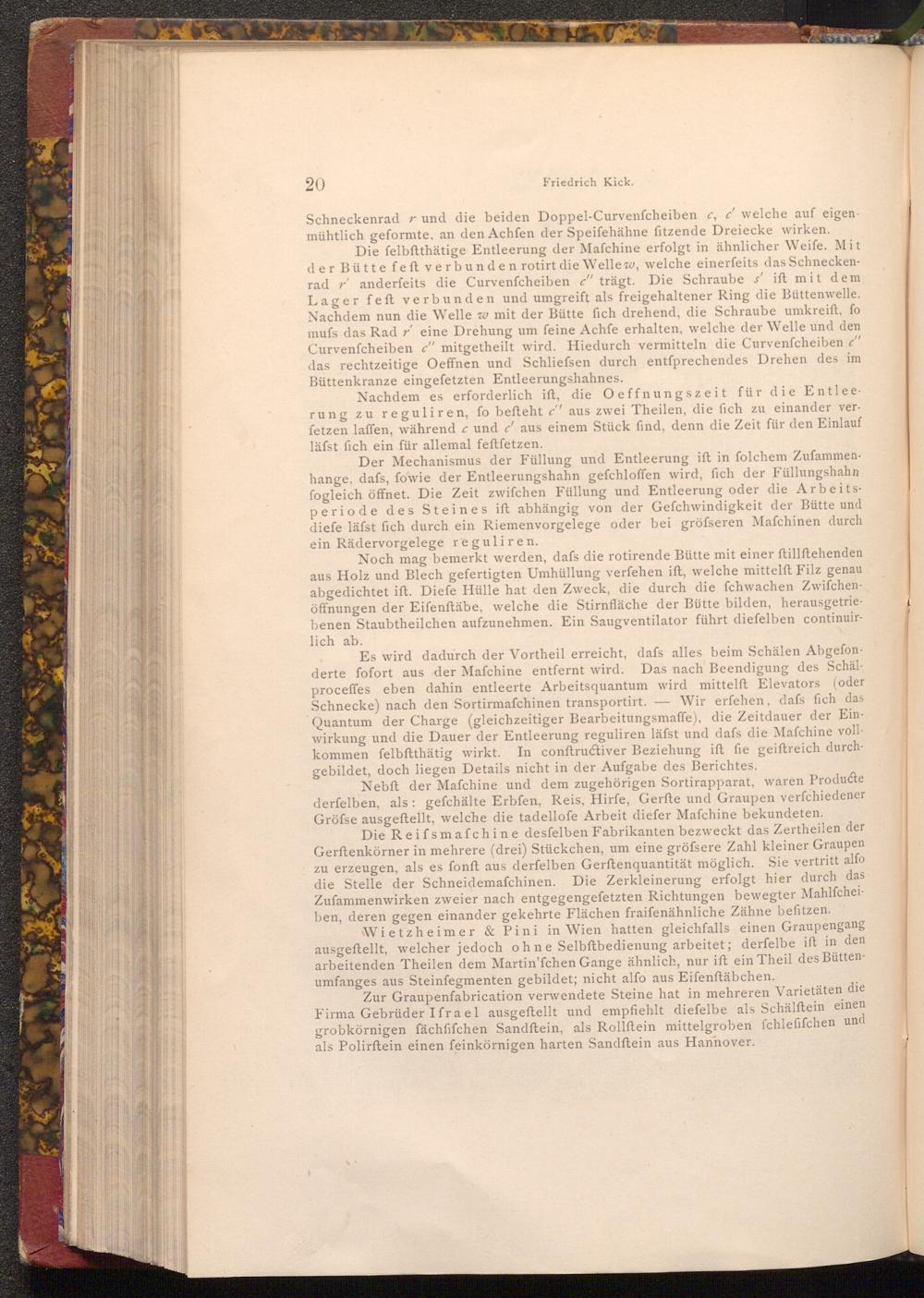 Wietzheimer& Pini in Wien hatten gleichfalls einen Graupengang ausgeftellt, welcher jedoch ohne Selbftbedienung arbeitet; derfelbe ift in den arbeitenden Theilen dem Martin'fchen Gange ähnlich, nur ift ein Theil des Büttenumfanges aus Steinfegmenten gebildet; nicht alfo aus Eifenftäbchen.