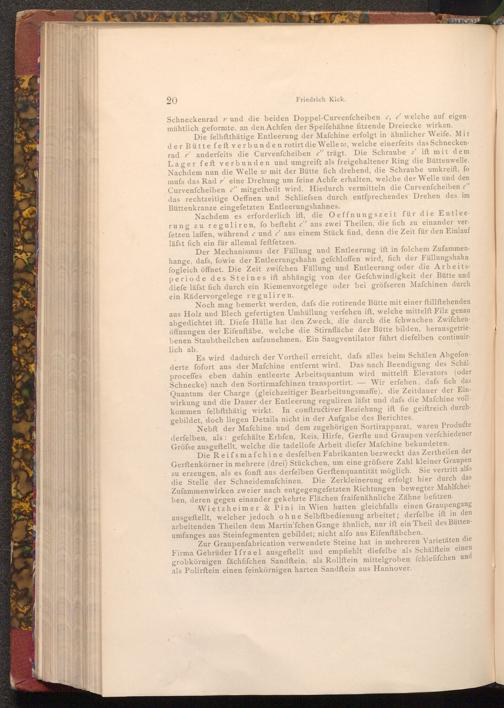 Es wird dadurch der Vortheil erreicht, dafs alles beim Schälen Abgefonderte fofort aus der Mafchine entfernt wird. Das nach Beendigung des Schälproceffes eben dahin entleerte Arbeitsquantum wird mittelft Elevators( oder Schnecke) nach den Sortirmafchinen transportirt.-Wir erfehen, dafs fich das Quantum der Charge( gleichzeitiger Bearbeitungsmaffe), die Zeitdauer der Einwirkung und die Dauer der Entleerung reguliren läfst und dafs die Mafchine vollkommen felbftthätig wirkt. In conftructiver Beziehung ift fie geiftreich durchgebildet, doch liegen Details nicht in der Aufgabe des Berichtes.