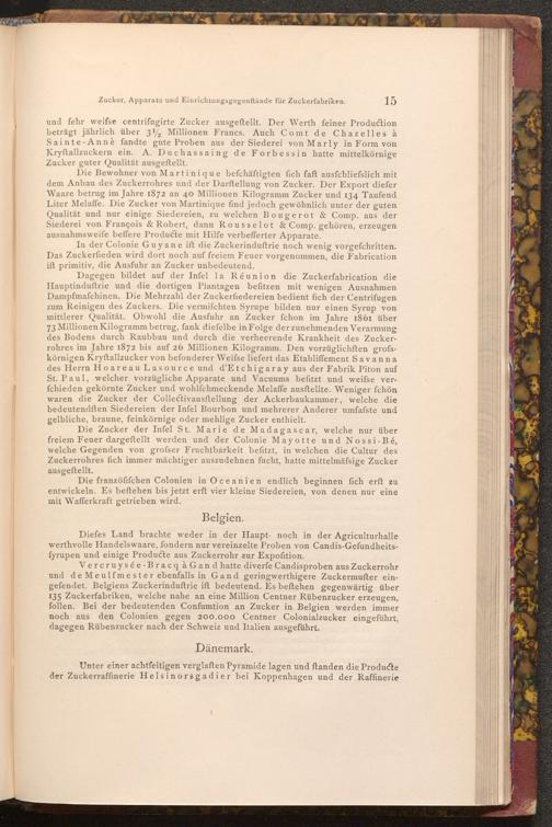 Dagegen bildet auf der Infel la Réunion die Zuckerfabrication die Hauptinduftrie und die dortigen Plantagen befitzen mit wenigen Ausnahmen Dampfmafchinen. Die Mehrzahl der Zuckerfiedereien bedient fich der Centrifugen zum Reinigen des Zuckers. Die vermifchten Syrupe bilden nur einen Syrup von mittlerer Qualität. Obwohl die Ausfuhr an Zucker fchon im Jahre 1861 über 73 Millionen Kilogramm betrug, fank diefelbe in Folge der zunehmenden Verarmung des Bodens durch Raubbau und durch die verheerende Krankheit des Zuckerrohres im Jahre 1872 bis auf 26 Millionen Kilogramm. Den vorzüglichften grofskörnigen Kryftallzucker von befonderer Weifse liefert das Etabliffement Savanna des Herrn Hoareau Lasource und d'Etchigaray aus der Fabrik Piton auf St. Paul, welcher vorzügliche Apparate und Vacuums befitzt und weifse verfchieden gekörnte Zucker und wohlfchmeckende Melaffe ausftellte. Weniger fchön waren die Zucker der Collectivausftellung der Ackerbaukammer, welche die bedeutendften Siedereien der Infel Bourbon und mehrerer Anderer umfafste und gelbliche, braune, feinkörnige oder mehlige Zucker enthielt.