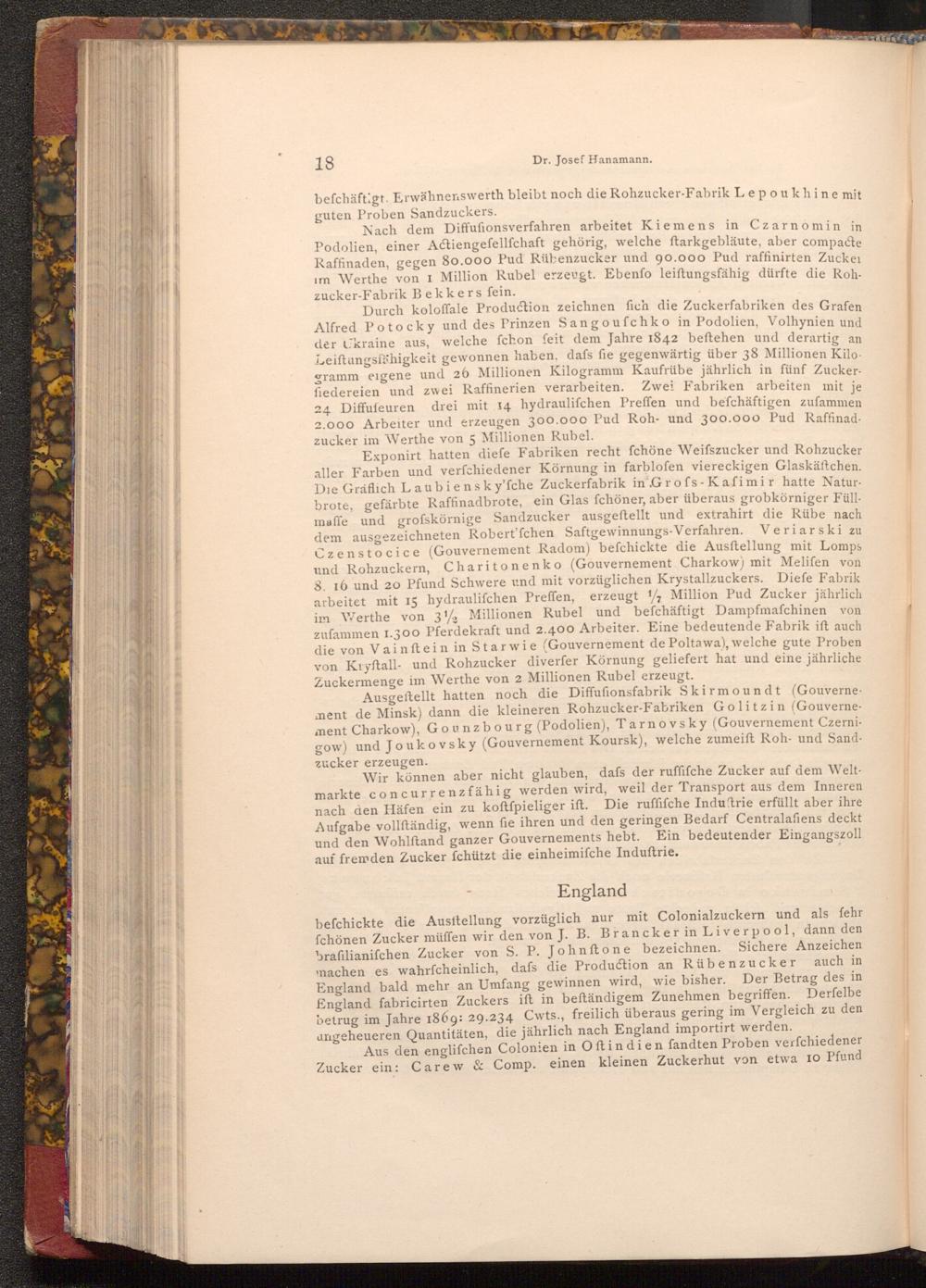 Nach dem Diffufionsverfahren arbeitet Kiemens in Czarnomin in Podolien, einer Actiengeſellſchaft gehörig, welche ftarkgebläute, aber compacte Raffinaden, gegen 80.000 Pud Rübenzucker und 90.000 Pud raffinirten Zucker im Werthe von 1 Million Rubel erzeugt. Ebenfo leiftungsfähig dürfte die Rohzucker- Fabrik Bekkers fein.