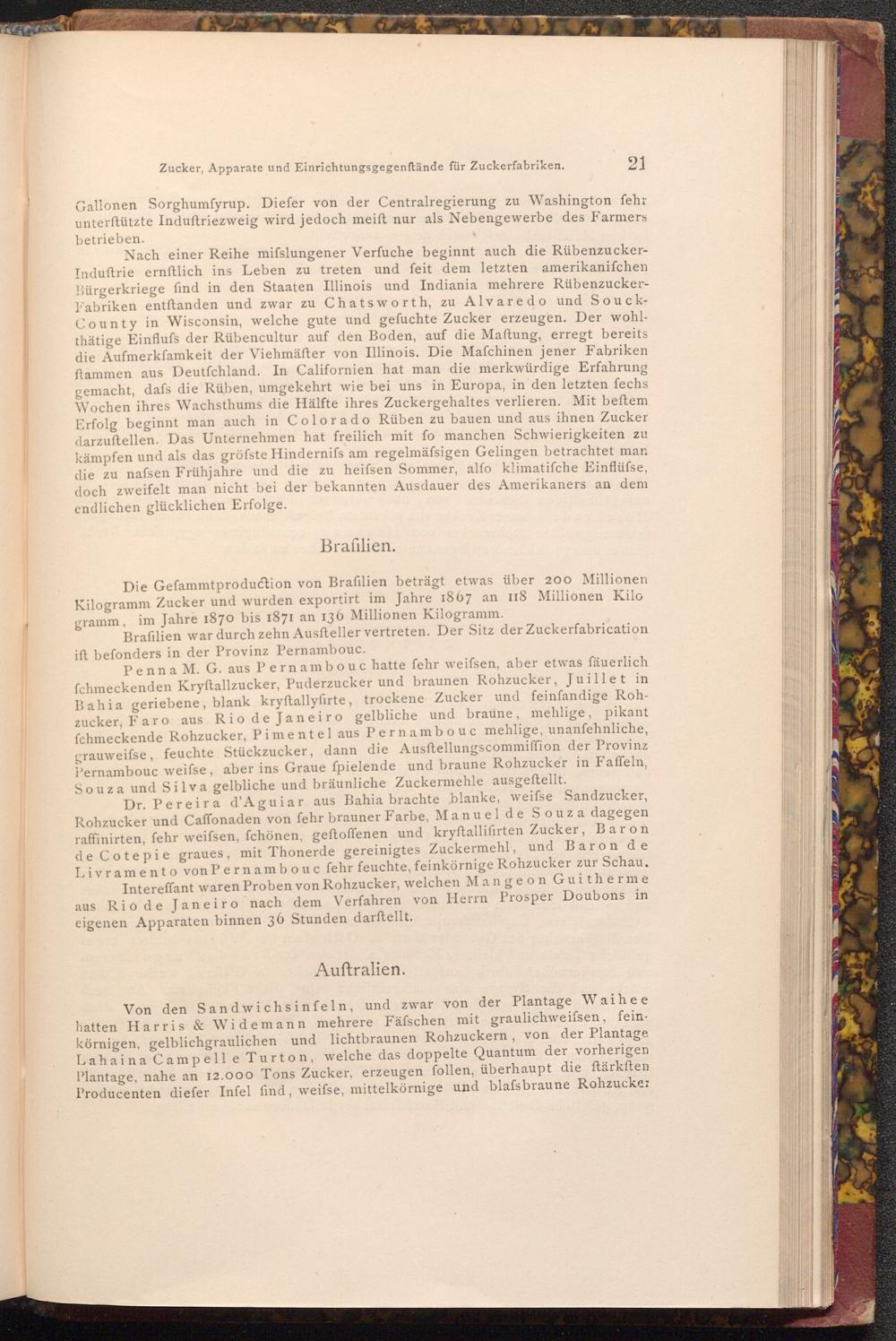Brafilien war durch zehn Ausfteller vertreten. Der Sitz der Zuckerfabrication ift befonders in der Provinz Pernambouc.