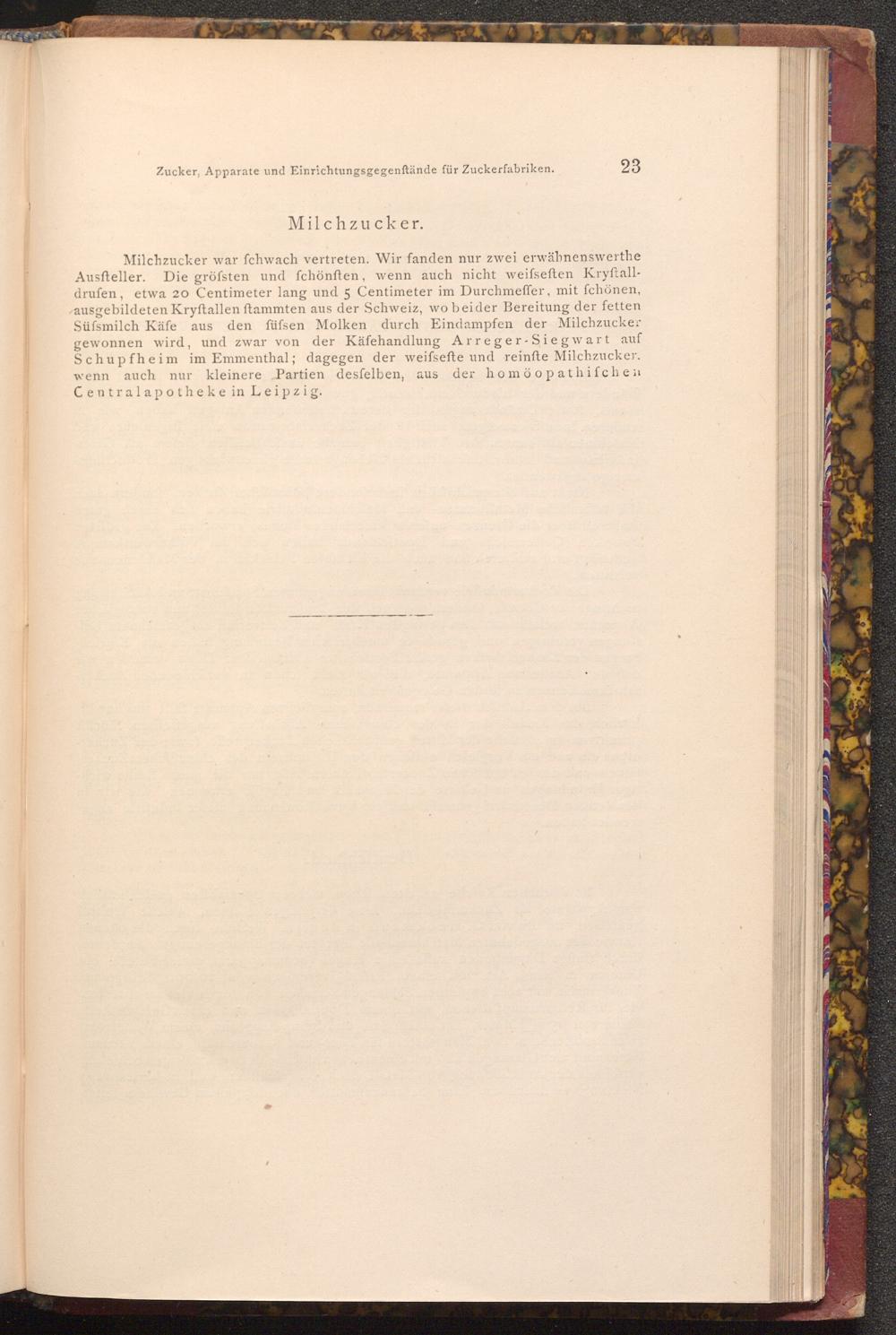 Milchzucker war fchwach vertreten. Wir fanden nur zwei erwähnenswerthe Ausfteller. Die gröfsten und fchönften, wenn auch nicht weifseften Kryftalldrufen, etwa 20 Centimeter lang und 5 Centimeter im Durchmeffer, mit fchönen, ausgebildeten Kryftallen ftammten aus der Schweiz, wo beider Bereitung der fetten Süfsmilch Käfe aus den füfsen Molken durch Eindampfen der Milchzucker gewonnen wird, und zwar von der Käfehandlung Arreger- Siegwart auf Schupfheim im Emmenthal; dagegen der weifsefte und reinfte Milchzucker. auch nur kleinere Partien desfelben, aus der homöopathifchen Centralapotheke in Leipzig.