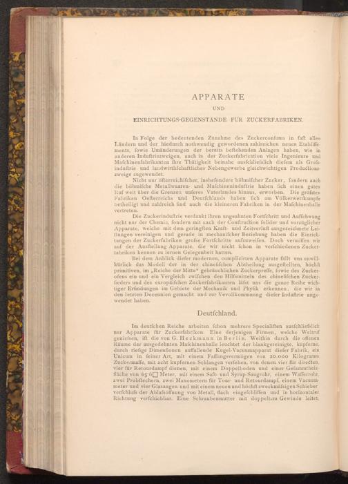 Die Zuckerinduftrie verdankt ihren ungeahnten Fortfchritt und Auffchwung nicht nur der Chemie, fondern mit auch der Conftruction folider und vorzüglicher Apparate, welche mit dem geringften Kraft- und Zeitverluft ausgezeichnete Leiftungen vereinigen und gerade in mechanifcher Beziehung haben die Einrichtungen der Zuckerfabriken grofse Fortfchritte aufzuweifen. Doch vermiffen wir auf der Ausftellung Apparate, die wir nicht fchon in verfchiedenen Zuckeriabriken kennen zu lernen Gelegenheit hatten.