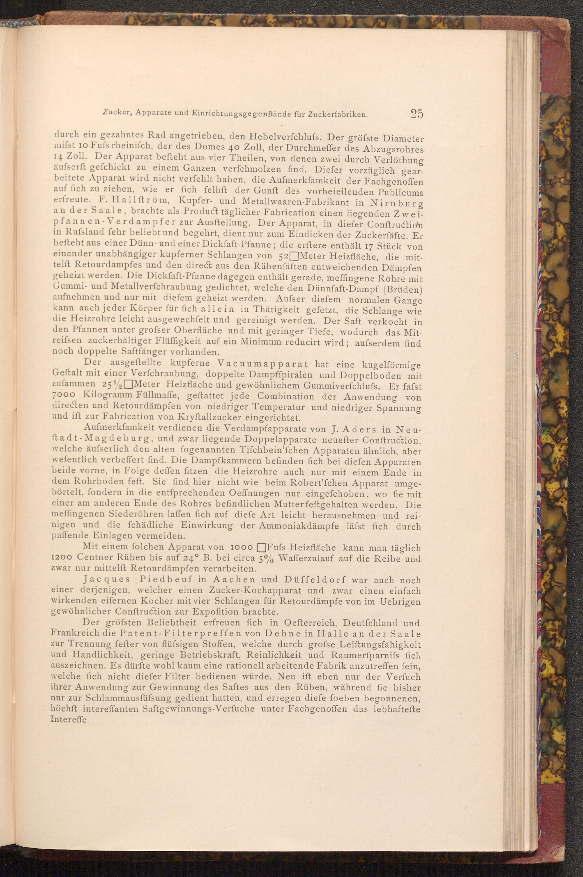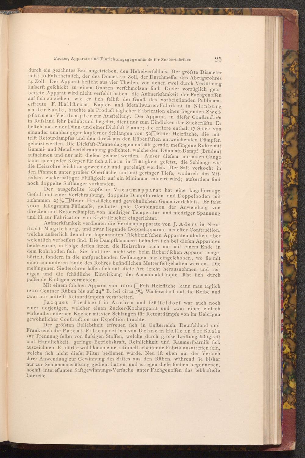 Der ausgeftellte kupferne Vacuumapparat hat eine kugelförmige Geftalt mit einer Verfchraubung, doppelte Dampffpiralen und Doppelboden mit zufammen 25 Meter Heizfläche und gewöhnlichem Gummiverfchlufs. Er fafst 7000 Kilogramm Füllmaffe, geftattet jede Combination der Anwendung von directen und Retourdämpfen von niedriger Temperatur und niedriger Spannung und ift zur Fabrication von Kryftallzucker eingerichtet.
