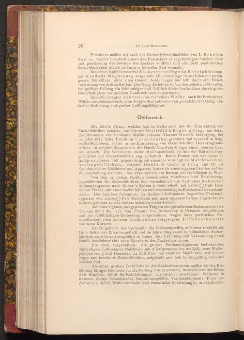 Die ältefte Firma, welche fich in Oefterreich mit der Einrichtung von Zuckerfabriken befafste, war die von Breitfeld& Evans in Prag, aus deren Etabliffements der berühmte Mafchinenbauer Vincenz Daněk hervorging, der im Jahre 1854 feine Fabrik in Carolinenthal gründete und zunächft in Bergwerks- Mafchinen, später in der Einrichtung von Zuckerfabriken Hervorragendes leiftete, in welcher Branche fich die Daněk'fche Fabrik fogar einen überfeeifchen Ruf erwarb. Die Gefchichte diefer Maſchinenfabrik ift mit der Entwicklungsgefchichte der Zuckerinduftrie eng verknüpft. Beide Firmen mit der fpäter in Auffig errichteten find gegenwärtig mit einander vereinigt als MafchinenbauActiengefellfchaft, vormals Daněk& Comp. in Prag und für die Expofition ihrer Mafchinen und Apparate hatten fie einen eigenen Pavillon auf der Weltausstellung errichtet. Seit 1872 befteht ein Bureau der Gefellfchaft in Wien. Von den in diefem Pavillon befindlichen Mafchinen und Einrichtungsgegenftänden für Zuckerfabriken find vornehmlich die ftattlichen ſtehenden Abdampfapparate nach Robert's Syftem à doubl effect, mit 3.000 Fufs Heizröhren- Fläche, mit einer höchft foliden und zweckmässigen Blecharbeit bemerkenswerth. Die daneben ftehenden, für Rufsland beftimmten liegenden Verdampfapparate von 2.000 Fufs Heizfläche mit nach eigenem Syftem abgedichteten Röhren gehören zu den beften Arbeiten diefer Fabrik.