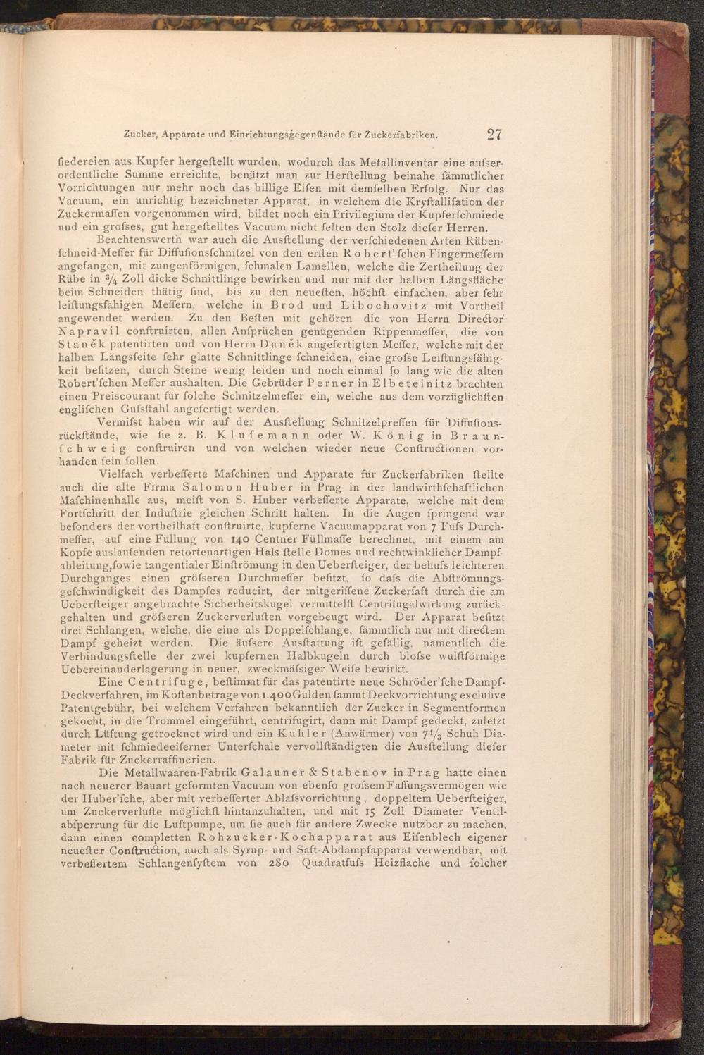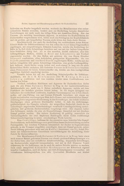 Die Metallwaaren- Fabrik Galauner& Stabenov in Prag hatte einen nach neuerer Bauart geformten Vacuum von ebenfo grofsem Faffungsvermögen wie der Huber'íche, aber mit verbefferter Ablafsvorrichtung, doppeltem Ueberfteiger, um Zuckerverlufte möglichft hintanzuhalten, und mit 15 Zoll Diameter Ventilabfperrung für die Luftpumpe, um fie auch für andere Zwecke nutzbar zu machen, dann einen completten Rohzucker- Kochapparat aus Eifenblech eigener neuefter Conftruction, auch als Syrup- und Saft- Abdampfapparat verwendbar, mit verbeffertem Schlangenfyftem von 280 Quadratfufs Heizfläche und folcher