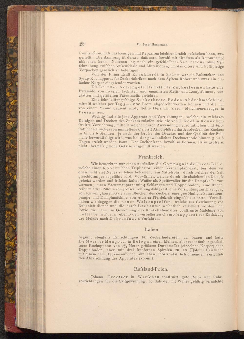 beginnt ebenfalls Einrichtungen für Zuckerfiedereien zu bauen und hatte De Morsier Mengotti in Bologna einen kleinen, aber recht fauber gearbeiteten Kochapparat von 13 Meter gröfstem Durchmeffer( einzelnen Körper) ohne Doppelboden, aber mit drei kupfernen Spiralen zu 20 Meter Heizfläche mit einem dem Heckmann'fchen ähnlichen, horizontal fich öffnenden Verfchlufs der Ablafsöffnung des Apparates exponirt.