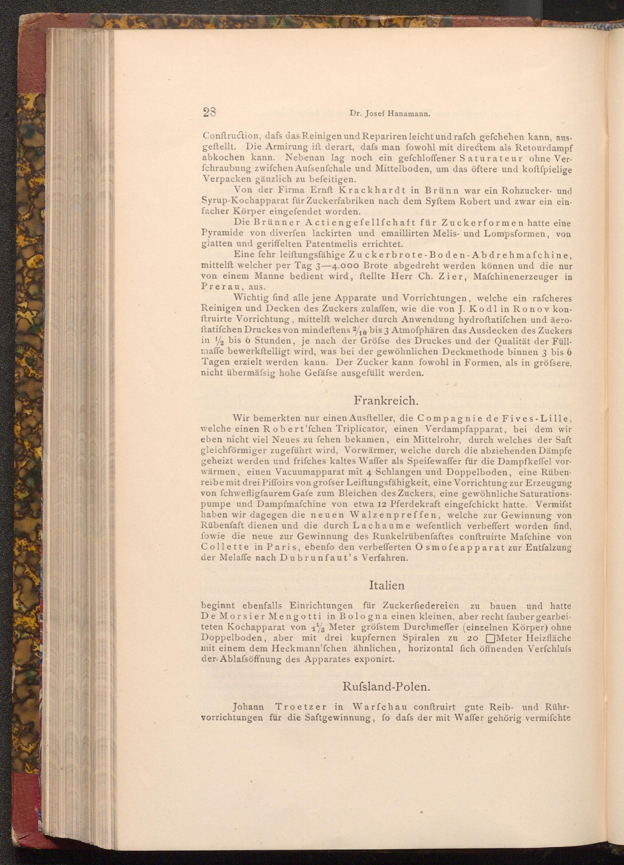 Wichtig find alle jene Apparate und Vorrichtungen, welche ein rafcheres Reinigen und Decken des Zuckers zulaffen, wie die von J. Kodl in Ronov konftruirte Vorrichtung, mittelft welcher durch Anwendung hydroftatifchen und äeroftatifchen Druckes von mindeftens 2/10 bis 3 Atmoſphären das Ausdecken des Zuckers in 2 bis 6 Stunden, je nach der Gröfse des Druckes und der Qualität der Füllmaffe bewerkstelligt wird, was bei der gewöhnlichen Deckmethode binnen 3 bis 6 Tagen erzielt werden kann. Der Zucker kann fowohl in Formen, als in gröfsere, nicht übermässig hohe Gefäfse ausgefüllt werden.