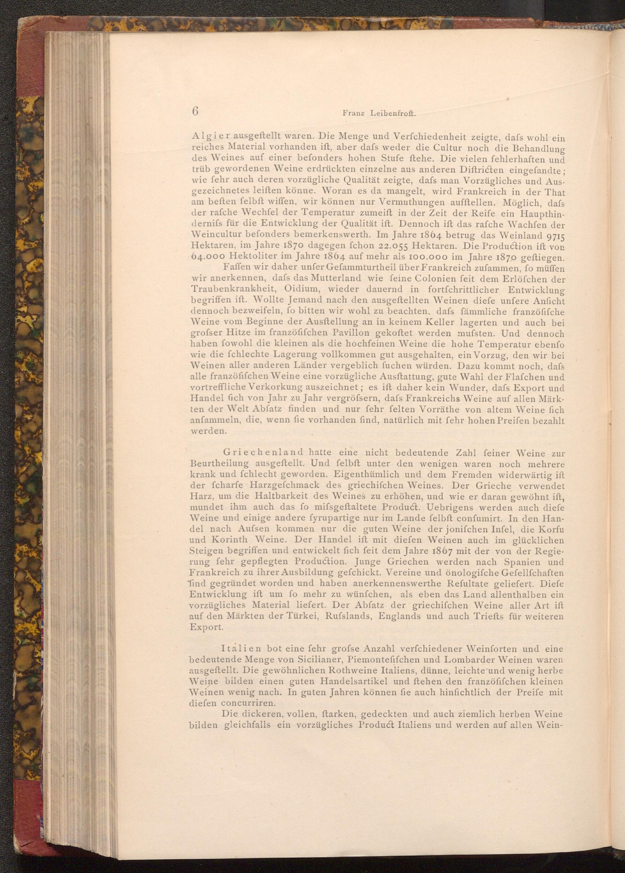 Algier ausgeftellt waren. Die Menge und Verfchiedenheit zeigte, dafs wohl ein reiches Material vorhanden ift, aber dafs weder die Cultur noch die Behandlung des Weines auf einer befonders hohen Stufe ftehe. Die vielen fehlerhaften und trüb gewordenen Weine erdrückten einzelne aus anderen Diftricten eingefandte; wie fehr auch deren vorzügliche Qualität zeigte, dafs man Vorzügliches und Ausgezeichnetes leiften könne. Woran es da mangelt, wird Frankreich in der That am beften felbft wiffen, wir können nur Vermuthungen aufftellen. Möglich, dafs der rafche Wechfel der Temperatur zumeift in der Zeit der Reife ein Haupthindernifs für die Entwicklung der Qualität ift. Dennoch ift das rafche Wachfen der Weincultur befonders bemerkenswerth. Im Jahre 1864 betrug das Weinland 9715 Hektaren, im Jahre 1870 dagegen fchon 22.055 Hektaren. Die Production ift von 64.000 Hektoliter im Jahre 1864 auf mehr als 100.000 im Jahre 1870 geftiegen. Faffen wir daher unfer Gefammturtheil über Frankreich zufammen, fo müffen wir anerkennen, dafs das Mutterland wie feine Colonien feit dem Erlöfchen der Traubenkrankheit, Oidium, wieder dauernd in fortfchrittlicher Entwicklung begriffen ift. Wollte Jemand nach den ausgeftellten Weinen diefe unfere Anficht dennoch bezweifeln, fo bitten wir wohl zu beachten, dafs fämmliche franzöfifche Weine vom Beginne der Ausftellung an in keinem Keller lagerten und auch bei grofser Hitze im franzöfifchen Pavillon gekoftet werden mufsten. Und dennoch haben fowohl die kleinen als die hochfeinen Weine die hohe Temperatur ebenfo wie die fchlechte Lagerung vollkommen gut ausgehalten, ein Vorzug, den wir bei Weinen aller anderen Länder vergeblich fuchen würden. Dazu kommt noch, dafs alle franzöfifchen Weine eine vorzügliche Ausftattung, gute Wahl der Flafchen und vortreffliche Verkorkung auszeichnet; es ift daher kein Wunder, dafs Export und Handel fich von Jahr zu Jahr vergrössern, dafs Frankreichs Weine auf allen Märkten der Welt Abfatz finden und nur fehr felten Vorräthe von altem Weine fich anfammeln, die, wenn fie vorhanden find, natürlich mit fehr hohen Preifen bezahlt werden.