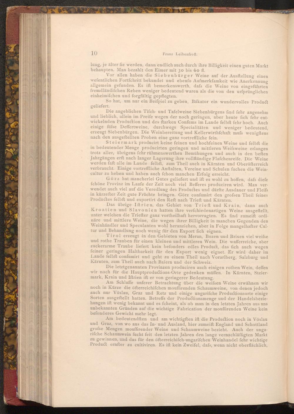 Die angeblichen Tifch- und Tafelweine Siebenbürgens find fehr angenehm und lieblich, allein im Preife wegen der noch geringen, aber heute fich fehr entwickelnden Production und des ftarken Confums im Lande felbft fehr hoch. Auch einige füfse Deffertweine, durchwegs Specialitäten und weniger bedeutend, erzeugt Siebenbürgen. Die Weinbereitung und Kellerwirthschaft mufs wenigftens nach den ausgeftellten Proben eine ganz vortreffliche fein.