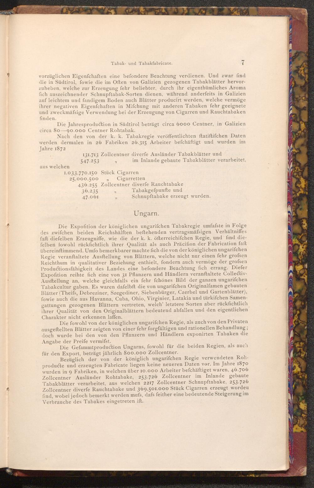 Die Expofition der königlichen ungarifchen Tabakregie umfafste in Folge des zwifchen beiden Reichshälften beftehenden vertragsmäfsigen Verhältniffes faft diefelben Erzeugniffe, wie die der k. k. öfterreichifchen Regie, und find diefelben fowohl rückfichtlich ihrer Qualität als auch Präcifion der Fabrication faft übereinftimmend. Umfo bemerkbarer machte fich die von der königlichen ungarifchen Regie veranstaltete Ausftellung von Blättern, welche nicht nur einen fehr grofsen Reichthum in qualitativer Beziehung enthielt, fondern auch vermöge der grofsen Productionsfähigkeit des Landes eine befondere Beachtung fich errang. Diefer Expofition reihte fich eine von 31 Pflanzern und Händlern veranstaltete CollectivAusftellung an, welche gleichfalls ein fehr fchönes Bild der ganzen ungarifchen Tabakcultur gaben. Es waren dafelbft die von ungarifchen Originalfamen gebauten Blätter( Theifs, Debreziner, Szegediner, Siebenbürger, Czerbel und Gartenblätter), fowie auch die aus Havanna, Cuba, Ohio, Virginier, Latakia und türkifchen Samengattungen gezogenen Blättern vertreten, welch' letztere Sorten aber rückfichtlich ihrer Qualität von den Originalblättern bedeutend abfallen und den eigentlichen Charakter nicht erkennen laffen.