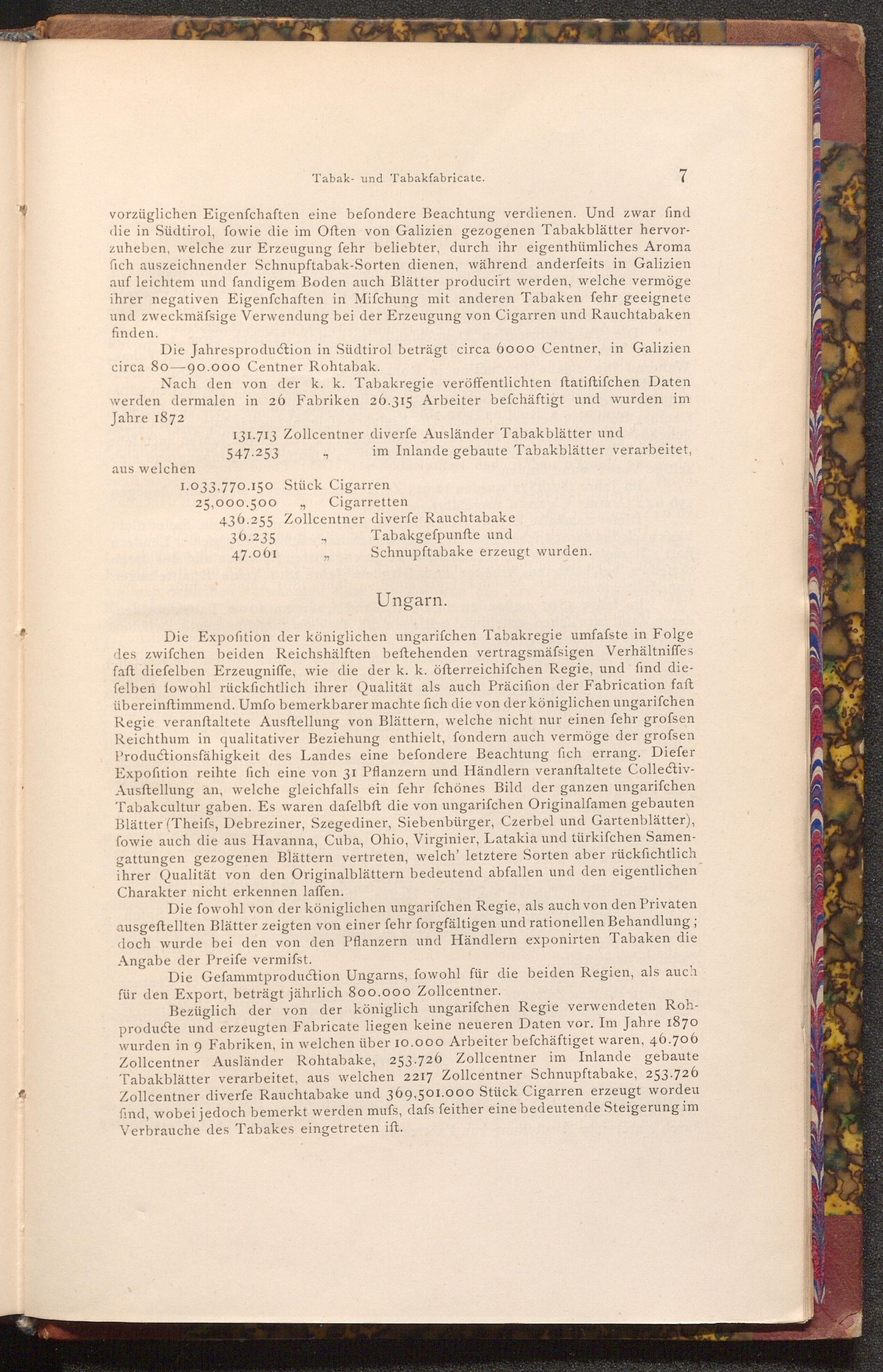 Bezüglich der von der königlich ungarifchen Regie verwendeten Rohproducte und erzeugten Fabricate liegen keine neueren Daten vor. Im Jahre 1870 wurden in 9 Fabriken, in welchen über 10.000 Arbeiter befchäftiget waren, 46.706 Zollcentner Ausländer Rohtabake, 253.726 Zollcentner im Inlande gebaute Tabakblätter verarbeitet, aus welchen 2217 Zollcentner Schnupftabake, 253.726 Zollcentner diverfe Rauchtabake und 369,501.000 Stück Cigarren erzeugt wordeu find, wobei jedoch bemerkt werden mufs, dafs feither eine bedeutende Steigerung im Verbrauche des Tabakes eingetreten ift.