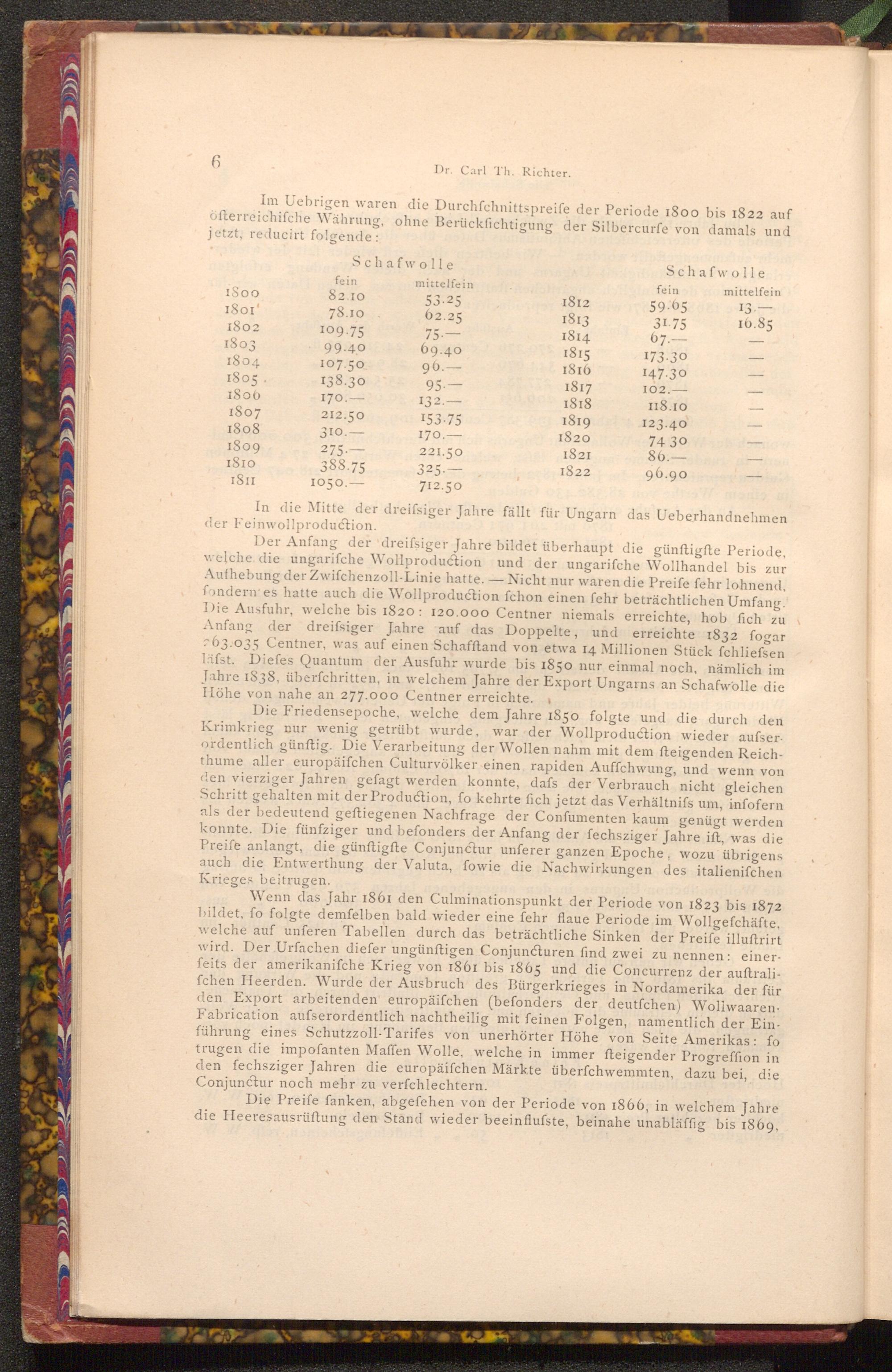 Wenn das Jahr 1861 den Culminationspunkt der Periode von 1823 bis 1872 bildet, fo folgte demfelben bald wieder eine fehr flaue Periode im Wollgefchäfte, welche auf unferen Tabellen durch das beträchtliche Sinken der Preife illuftrirt wird. Der Urfachen diefer ungünftigen Conjuncturen find zwei zu nennen: einerfeits der amerikaniſche Krieg von 1861 bis 1865 und die Concurrenz der auftralifchen Heerden. Wurde der Ausbruch des Bürgerkrieges in Nordamerika der für den Export arbeitenden europäiſchen( befonders der deutfchen) WollwaarenFabrication aufserordentlich nachtheilig mit feinen Folgen, namentlich der Einführung eines Schutzzoll- Tarifes von unerhörter Höhe von Seite Amerikas: fo trugen die impofanten Maffen Wolle, welche in immer fteigender Progreffion in den fechsziger Jahren die europäifchen Märkte überfchwemmten, dazu bei, die Conjunctur noch mehr zu verfchlechtern.