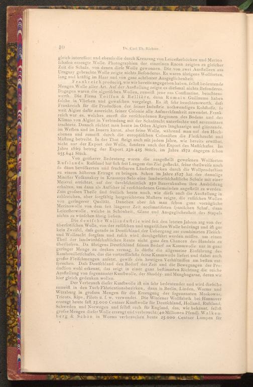 Von gröfserer Bedeutung waren die ausgeftellt gewefenen Wollforten Rufslands. Rufsland hat fich feit Langem das Ziel gefteckt, feine theilweife noch fo dünn bevölkerten und fruchtbaren Länderftrecken durch die Wollproduction zu einem höheren Ertrage zu bringen. Schon im Jahre 1827 hat der damalige Minifter Volkanskoy in Krasnoye- Selo eine landwirthschaftliche Schule mit einer Meierei errichtet, auf der durchfchnittlich 250 Bauernknaben ihre Ausbildung erhalten, um dann als Auffeher in verfchiedenen Gemeinden angeftellt zu werden. Zum grofsen Theile find freilich heute noch, wie diefs auch die Ausftellung in zahlreichen, aber forgfältig hergerichteten Muftern zeigte, die ruffifchen Wollen von geringerer Qualität. Daneben aber fah man fchon ganz vorzügliche Merinowolle von dem feit längerer Zeit acclimatifirten fpanifchen Schaf, dann Leiceſterwolle, welche in Schönheit, Glanz und Ausgeglichenheit des Stapels nichts zu wünſchen übrig liefsen.