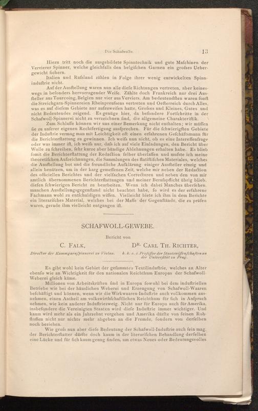 Zum Schluffe können wir uns einer Bemerkung nicht enthalten; wir müffen fie zu unferer eigenen Rechtfertigung ausfprechen. Für die fchwierigften Gebiete der Induftrie vermag man mit Leichtigkeit oft einen erfahrenen Gefchäftsmann für die Berichterstattung zu gewinnen. Ich weifs nun nicht, ob es eine Intereffenfrage oder was immer ift, ich weifs nur, dafs ich auf viele Einladungen, den Bericht über Wolle zu fchreiben, fehr kurze aber bündige Ablehnungen erhalten habe. Es blieb fomit die Berichterftattung der Redaction felber überlaffen und mufste ich meine theoretifchen Aufzeichnungen, die Sammlungen des ftatiftifchen Materiales, welches die Ausftellung bot und die freundliche Aufklärung einiger Ausfteller einzig und allein benützen, um in der karg gemeffenen Zeit, welche mir neben der Redaction des officiellen Berichtes und der vielfachen Correcturen und neben den von mir amtlich übernommenen Berichterstattungen und meiner Berufspflicht übrig blieb, diefen fchwierigen Bericht zu bearbeiten. Wenn ich dabei Manches überfehen, manchen Ausstellungsgegenftand nicht beachtet habe, fo wird es der erfahrene Fachmann wohl zu entfchuldigen wiffen. Vielleicht biete ich ihm in dem Berichte ein literarifches Material, welches bei der Maffe der Gegenstände, die zu prüfen waren, gerade ihm vielleicht entgangen ift.