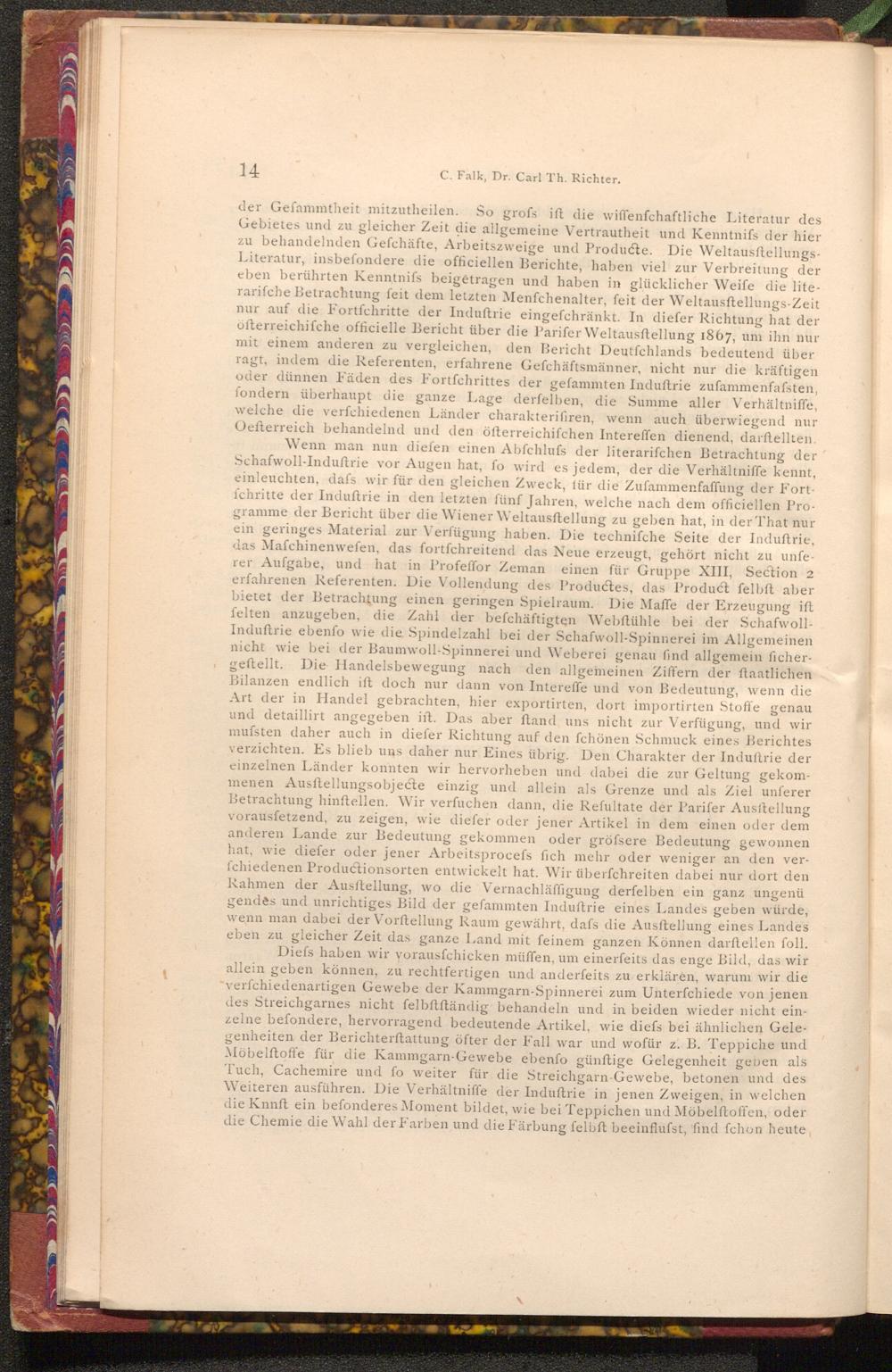 der Gefammtheit mitzutheilen. So grofs ift die wiffenfchaftliche Literatur des Gebietes und zu gleicher Zeit die allgemeine Vertrautheit und Kenntnifs der hier zu behandelnden Gefchäfte, Arbeitszweige und Producte. Die WeltausftellungsLiteratur, insbefondere die officiellen Berichte, haben viel zur Verbreitung der eben berührten Kenntnifs beigetragen und haben in glücklicher Weife die literarifche Betrachtung feit dem letzten Menfchenalter, feit der Weltausftellungs- Zeit nur auf die Fortfchritte der Induftrie eingefchränkt. In diefer Richtung hat der öfterreichifche officielle Bericht über die Parifer Weltausftellung 1867, um ihn nur mit einem anderen zu vergleichen, den Bericht Deutfchlands bedeutend über ragt, indem die Referenten, erfahrene Gefchäftsmänner, nicht nur die kräftigen oder dünnen Fäden des Fortfchrittes der gefammten Induftrie zufammenfafsten, fondern überhaupt die ganze Lage derfelben, die Summe aller Verhältniffe, welche die verfchiedenen Länder charakterifiren, wenn auch überwiegend nur Oefterreich behandelnd und den öfterreichifchen Intereffen dienend, darftellten. Wenn man nun diefen einen Abfchlufs der literarifchen Betrachtung der Schafwoll- Induftrie vor Augen hat, fo wird es jedem, der die Verhältniffe kennt, einleuchten, dafs wir für den gleichen Zweck, für die Zufammenfaffung der Fortfchritte der Induftrie in den letzten fünf Jahren, welche nach dem officiellen Programme der Bericht über die Wiener Weltausftellung zu geben hat, in der That nur ein geringes Material zur Verfügung haben. Die technifche Seite der Induftrie, das Mafchinenwefen, das fortfchreitend das Neue erzeugt, gehört nicht zu unferer Aufgabe, und hat in Profeffor Zeman einen für Gruppe XIII, Section 2 erfahrenen Referenten. Die Vollendung des Productes, das Product felbft aber bietet der Betrachtung einen geringen Spielraum. Die Maffe der Erzeugung ift felten anzugeben, die Zahl der befchäftigten Webftühle bei der SchafwollInduftrie ebenso wie die Spindelzahl bei der Schafwoll- Spinnerei im Allgemeinen nicht wie bei der Baumwoll- Spinnerei und Weberei genau find allgemein fichergeftellt. Die Handelsbewegung nach den allgemeinen Ziffern der ftaatlichen Bilanzen endlich ift doch nur dann von Intereffe und von Bedeutung, wenn die Art der in Handel gebrachten, hier exportirten, dort importirten Stoffe genau und detaillirt angegeben ist. Das aber ftand uns nicht zur Verfügung, und wir mufsten daher auch in diefer Richtung auf den fchönen Schmuck eines Berichtes verzichten. Es blieb uns daher nur Eines übrig. Den Charakter der Induftrie der einzelnen Länder konnten wir hervorheben und dabei die zur Geltung gekommenen Ausstellungsobjecte einzig und allein als Grenze und als Ziel unferer Betrachtung hinftellen. Wir verfuchen dann, die Refultate der Parifer Ausstellung vorausfetzend, zu zeigen, wie diefer oder jener Artikel in dem einen oder dem anderen Lande zur Bedeutung gekommen oder gröfsere Bedeutung gewonnen hat, wie diefer oder jener Arbeitsprocefs fich mehr oder weniger an den verfchiedenen Productionsorten entwickelt hat. Wir überfchreiten dabei nur dort den Rahmen der Ausftellung, wo die Vernachläffigung derfelben ein ganz ungenü gendes und unrichtiges Bild der gefammten Induftrie eines Landes geben würde, wenn man dabei der Vorftellung Raum gewährt, dafs die Ausftellung eines Landes eben zu gleicher Zeit das ganze Land mit feinem ganzen Können darftellen foll. Diefs haben wir vorausfchicken müffen, um einerfeits das enge Bild, das wir allein geben können, zu rechtfertigen und anderfeits zu erklären, warum wir die verfchiedenartigen Gewebe der Kammgarn- Spinnerei zum Unterfchiede von jenen des Streichgarnes nicht felbftftändig behandeln und in beiden wieder nicht einzelne befondere, hervorragend bedeutende Artikel, wie diefs bei ähnlichen Gelegenheiten der Berichterstattung öfter der Fall war und wofür z. B. Teppiche und Möbelftoffe für die Kammgarn- Gewebe ebenfo günftige Gelegenheit geben als Tuch, Cachemire und fo weiter für die Streichgarn- Gewebe, betonen und des Weiteren ausführen. Die Verhältniffe der Induftrie in jenen Zweigen, in welchen die Knnft ein befonderes Moment bildet, wie bei Teppichen und Möbelftoffen, oder die Chemie die Wahl der Farben und die Färbung felbft beeinflufst, find fchon heute