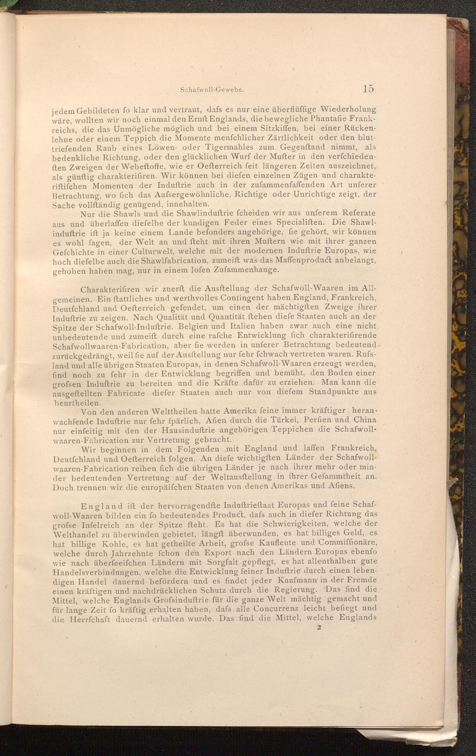 Charakterifiren wir zuerft die Ausftellung der Schafwoll- Waaren im Allgemeinen. Ein ftattliches und werthvolles Contingent haben England, Frankreich, Deutſchland und Oefterreich gefendet, um einen der mächtigften Zweige ihrer Induftrie zu zeigen. Nach Qualität und Quantität ftehen diefe Staaten auch an der Spitze der Schafwoll- Induftrie. Belgien und Italien haben zwar auch eine nicht unbedeutende und zumeift durch eine rafche Entwicklung fich charakterifirende Schafwollwaaren- Fabrication, aber fie werden in unferer Betrachtung bedeutend zurückgedrängt, weil fie auf der Ausftellung nur fehr fchwach vertreten waren. Rufsland und alle übrigen Staaten Europas, in denen Schafwoll- Waaren erzeugt werden, find noch zu fehr in der Entwicklung begriffen und bemüht, den Boden einer grofsen Induftrie zu bereiten und die Kräfte dafür zu erziehen. Man kann die ausgeftellten Fabricate diefer Staaten auch nur von diefem Standpunkte aus beurtheilen.