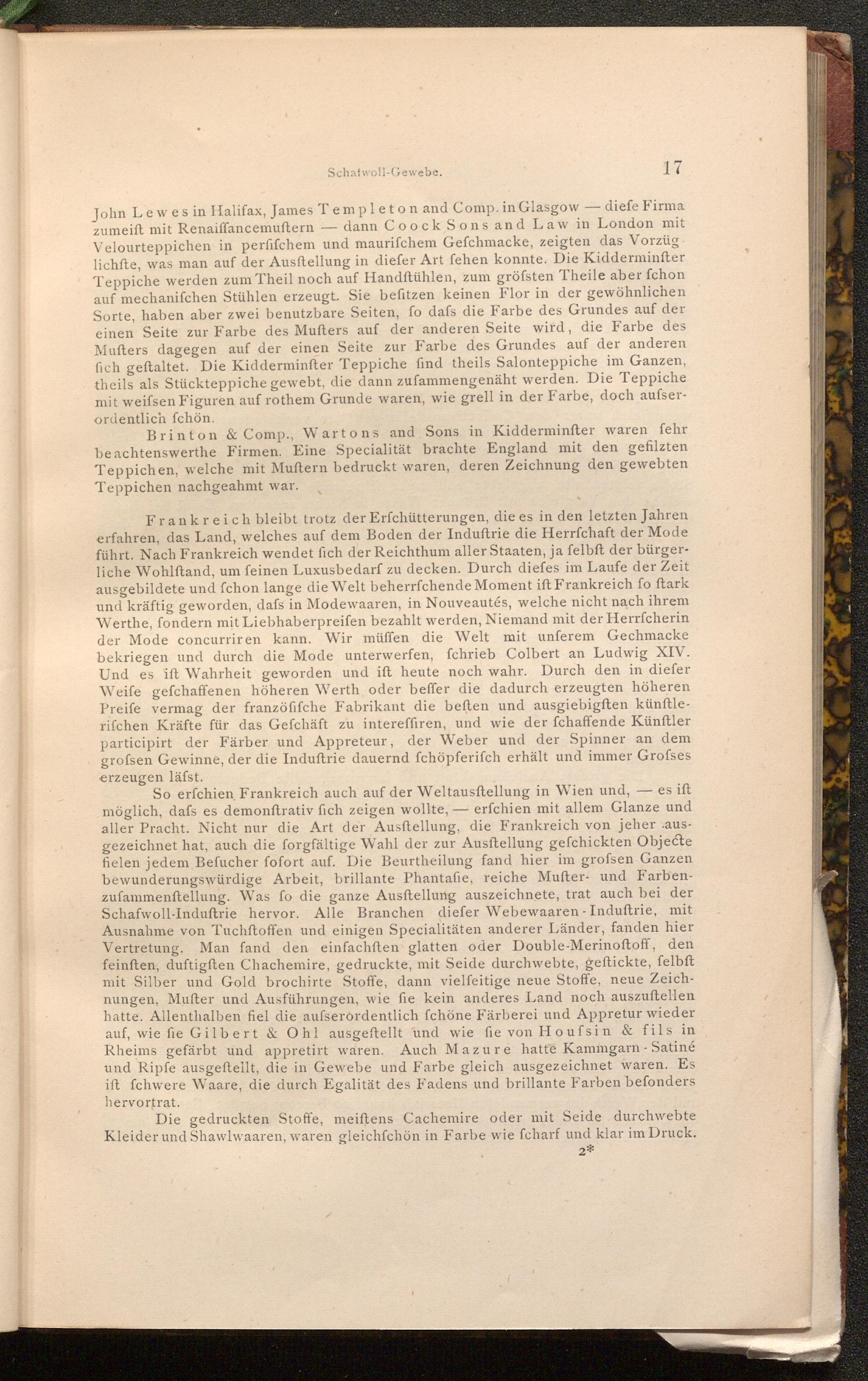 Brinton& Comp., Wartons and Sons in Kidderminſter waren fehr beachtenswerthe Firmen. Eine Specialität brachte England mit den gefilzten Teppichen, welche mit Muftern bedruckt waren, deren Zeichnung den gewebten Teppichen nachgeahmt war.
