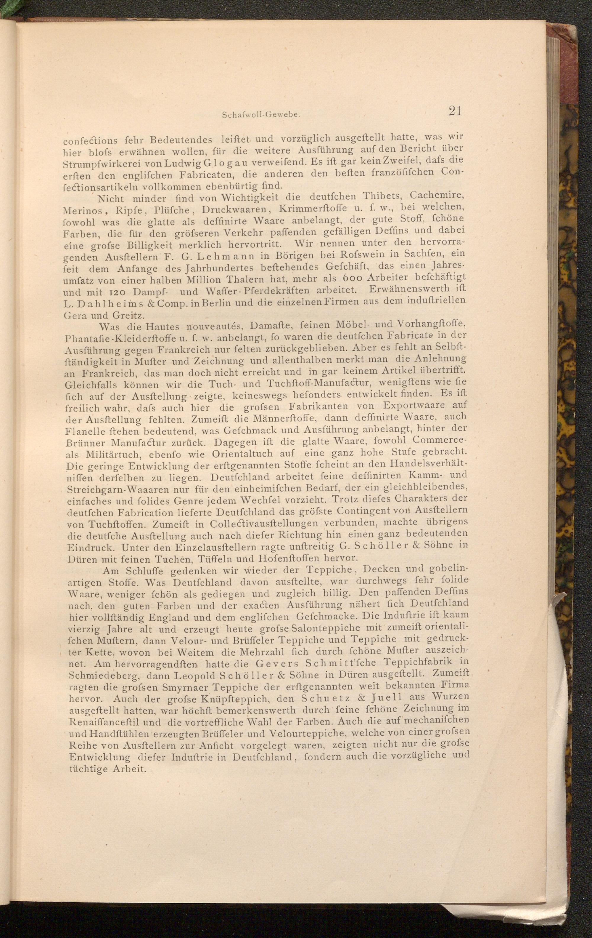 Nicht minder find von Wichtigkeit die deutfchen Thibets, Cachemire, Merinos, Ripfe, Plüfche, Druckwaaren, Krimmerftoffe u. f. w., bei welchen, fowohl was die glatte als deffinirte Waare anbelangt, der gute Stoff, fchöne Farben, die für den gröfseren Verkehr paffenden gefälligen Deffins und dabei eine grofse Billigkeit merklich hervortritt. Wir nennen unter den hervorragenden Ausftellern F. G. Lehmann in Börigen bei Rofswein in Sachfen, ein feit dem Anfange des Jahrhundertes beftehendes Gefchäft, das einen Jahresumfatz von einer halben Million Thalern hat, mehr als 600 Arbeiter befchäftigt Erwähnenswerth ift und mit 120 Dampf- und Waffer- Pferdekräften arbeitet. L. Dahlheims& Comp. in Berlin und die einzelnen Firmen aus dem induftriellen Gera und Greitz.
