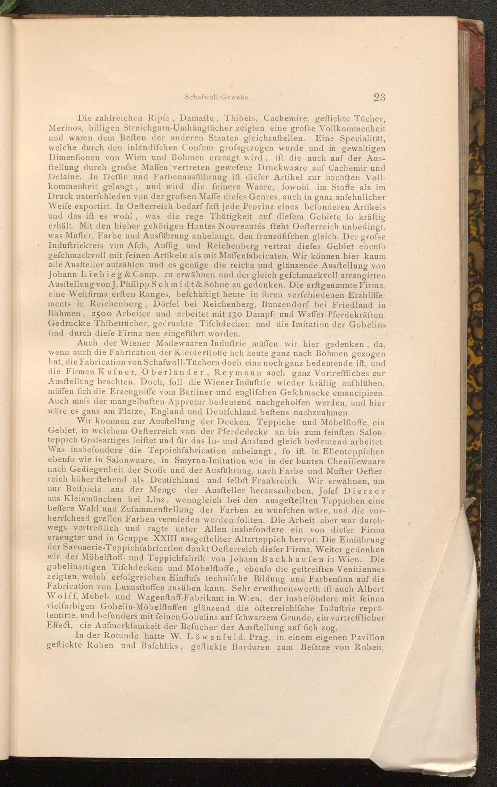 Die zahlreichen Ripfe, Damafte, Thibets, Cachemire, geftickte Tücher, Merinos, billigen Streichgarn- Umhängtücher zeigten eine grofse Vollkommenheit und waren dem Beften der anderen Staaten gleichzuftellen. Eine Specialität, welche durch den inländifchen Confum grofsgezogen wurde und in gewaltigen Dimenfionen von Wien und Böhmen erzeugt wird, ift die auch auf der Ausftellung durch grofse Maffen vertreten gewefene Druckwaare auf Cachemir und Delaine. In Deffin und Farbenausführung ift diefer Artikel zur höchften Vollkommenheit gelangt, und wird die feinere Waare, fowohl im Stoffe als im Druck unterfchieden von der grofsen Maffe diefes Genres, auch in ganz anfehnlicher Weife exportirt. In Oefterreich bedarf faft jede Provinz eines befonderen Artikels und das ift es wohl, was die rege Thätigkeit auf diefem Gebiete fo kräftig erhält. Mit den hieher gehörigen Hautes Nouveautés fteht Oefterreich unbedingt, was Mufter, Farbe und Ausführung anbelangt, den franzöfifchen gleich. Der grofse Induftriekreis von Afch, Auffig und Reichenberg vertrat diefes Gebiet ebenfo gefchmackvoll mit feinen Artikeln als mit Maffenfabricaten. Wir können hier kaum alle Ausfteller aufzählen und es genüge die reiche und glänzende Ausftellung von Johann Liebieg& Comp. zu erwähnen und der gleich gefchmackvoll arrangirten Ausftellung von J. Philipp Schmidt& Söhne zu gedenken. Die erftgenannte Firma, eine Weltfirma erften Ranges, befchäftigt heute in ihren verfchiedenen Etabliffements in Reichenberg, Dörfel bei Reichenberg, Bunzendorf bei Friedland in Böhmen, 2500 Arbeiter und arbeitet mit 130 Dampf- und Waffer- Pferdekräften. Gedruckte Thibettücher, gedruckte Tifchdecken und die Imitation der Gobelins find durch diefe Firma neu eingeführt worden.