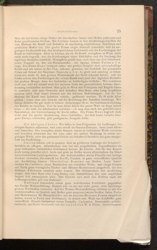 Rufsland bekundete einen ganz bedeutenden Fortfchritt gegenüber der Parifer Weltausstellung. Damals war es nur mit wohl guten, aber durchwegs groben Wollftoffen vertreten. Auf der Wiener Weltausftellung erfchien es mit den verfchiedenften, in Qualität und Mufter ganz ausgezeichneten Stoffen. Seine Tuche und Modewaaren für Männerkleider, wie fie einzelne Moskauer Firmen ausgeftellt hatten, waren in Farbe und Gefchmack, in Arbeit und Wahl des Rohftoffes ganz vortrefflich. Ebenfo bedeutend waren Damafte, Cachemire, Nouveautés, gefärbt, bedruckt, mit Seide durchwebt wie die von Jo kifch W.& Söhne, Gouvernement
