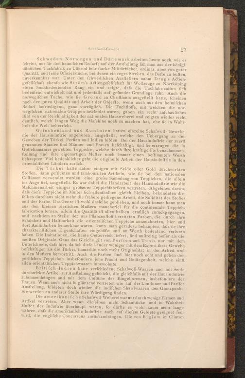Die amerikanifche Schafwoll- Weberei war nur durch wenige Firmen und Artikel vertreten. Aber wenn diefelben nicht Schauftücke und in Wahrheit Mufter der Induftrie überhaupt waren, fo dürfte es wohl kaum mehr lange währen, dafs die amerikanifche Induſtrie auch auf diefem Gebiete geeignet fein wird, die englifche Concurrenz zurückzudrängen. Die von Biglow in Clinton