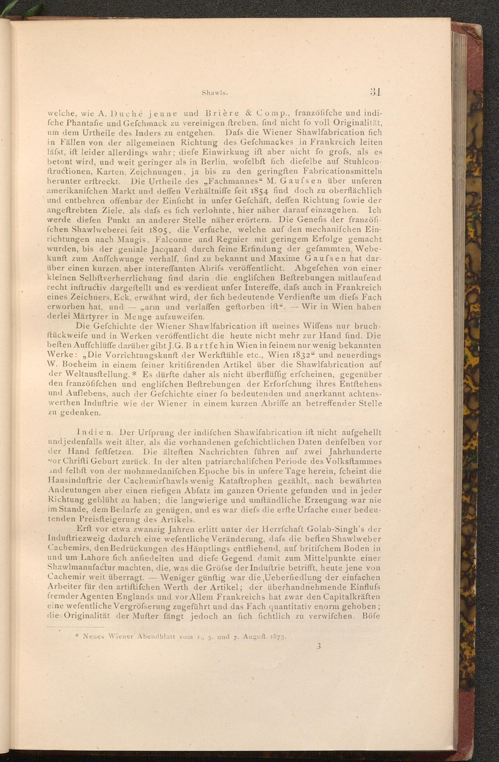 Die Gefchichte der Wiener Shawlfabrication ift meines Wiffens nur bruchftückweife und in Werken veröffentlicht die heute nicht mehr zur Hand find. Die beften Auffchlüffe darüber gibt J.G. Bartfchin Wien in feinem nur wenig bekannten Werke: Die Vorrichtungskunft der Werkftühle etc., Wien 1832" und neuerdings W. Boeheim in einem feiner kritifirenden Artikel über die Shawlfabrication auf der Weltausftellung. Es dürfte daher als nicht überflüffig erfcheinen, gegenüber den franzöfifchen und englifchen Beftrebungen der Erforschung ihres Entſtehens und Auflebens, auch der Gefchichte einer fo bedeutenden und anerkannt achtenswerthen Induftrie wie der Wiener in einem kurzen Abriffe an betreffender Stelle zu gedenken.