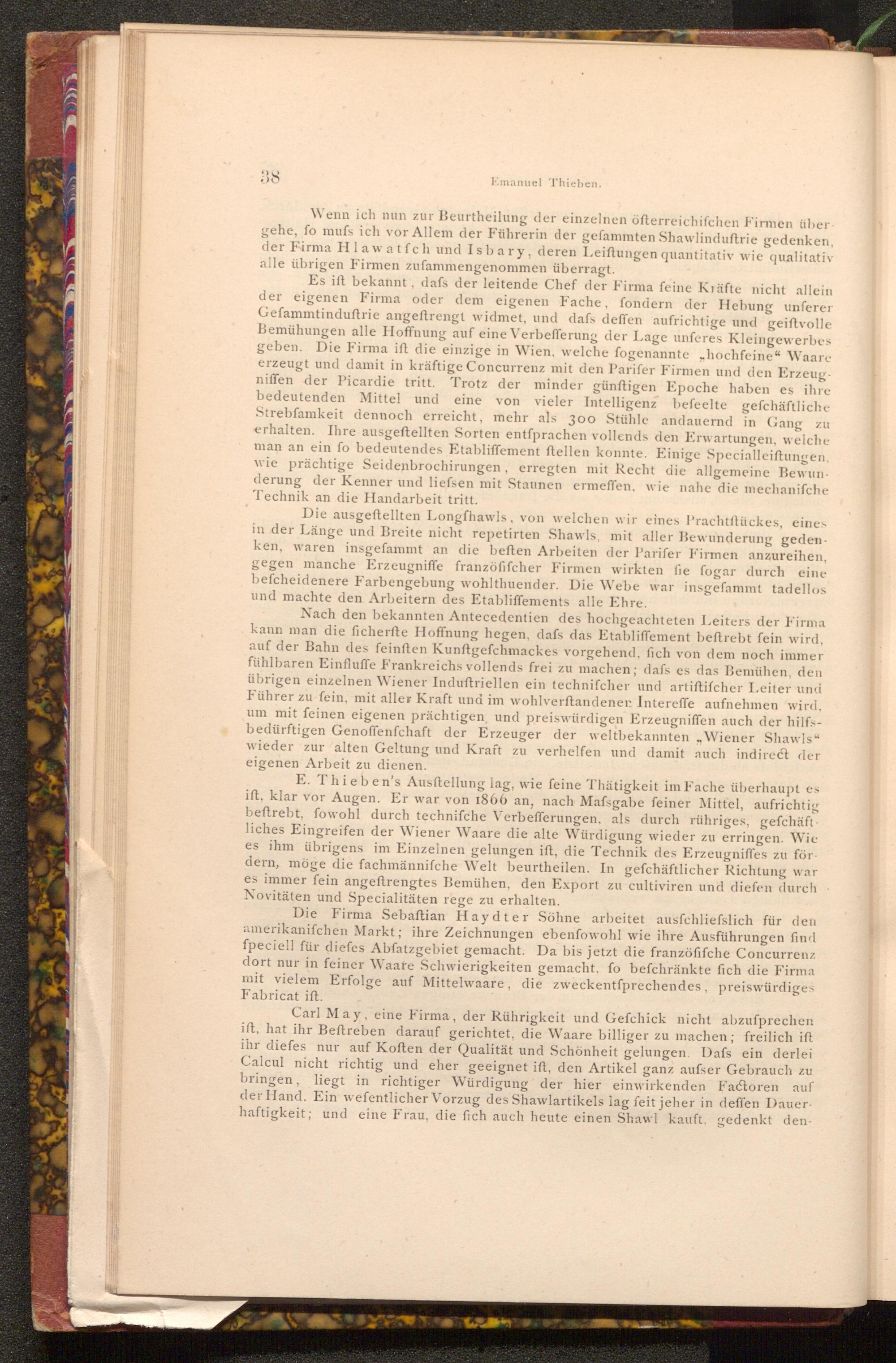 Die Firma Sebaftian Haydter Söhne arbeitet ausfchliefslich für den amerikanifchen Markt; ihre Zeichnungen ebenfowohl wie ihre Ausführungen find fpeciell für diefes Abfatzgebiet gemacht. Da bis jetzt die franzöfifche Concurrenz dort nur in feiner Waare Schwierigkeiten gemacht, fo befchränkte fich die Firma mit vielem Erfolge auf Mittelwaare, die zweckentfprechendes, preiswürdiges Fabricat ift.