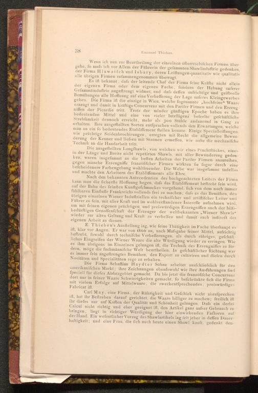 Nach den bekannten Antecedentien des hochgeachteten Leiters der Firma kann man die ficherfte Hoffnung hegen, dafs das Etabliffement beftrebt fein wird, auf der Bahn des feinften Kunftgefchmackes vorgehend, fich von dem noch immer fühlbaren Einfluffe Frankreichs vollends frei zu machen; dafs es das Bemühen, den übrigen einzelnen Wiener Induftriellen ein technifcher und artiftifcher Leiter und Führer zu fein, mit aller Kraft und im wohlverftandener Intereffe aufnehmen wird, um mit feinen eigenen prächtigen, und preiswürdigen Erzeugniffen auch der hilfsbedürftigen Genoffenfchaft der Erzeuger der weltbekannten Wiener Shawls" wieder zur alten Geltung und Kraft zu verhelfen und damit auch indirect der eigenen Arbeit zu dienen.