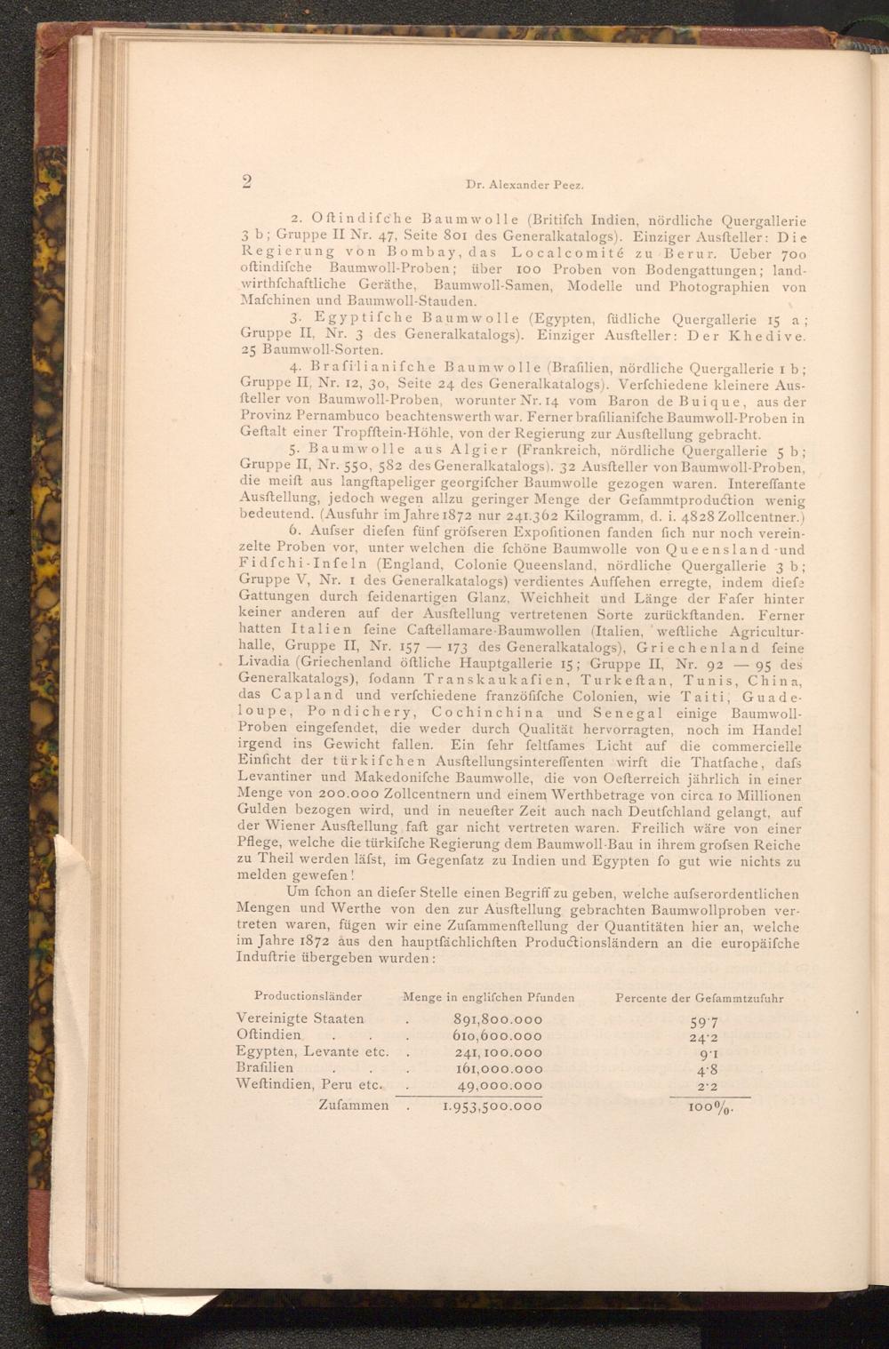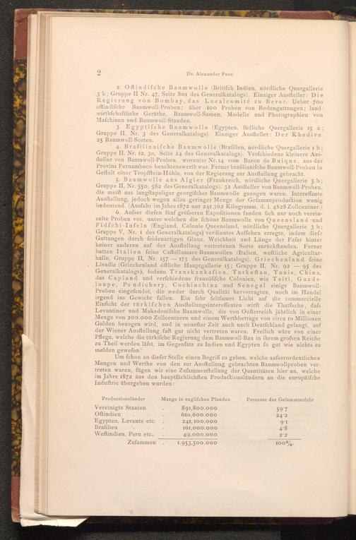 Um fchon an diefer Stelle einen Begriff zu geben, welche aufserordentlichen Mengen und Werthe von den zur Ausftellung gebrachten Baumwollproben vertreten waren, fügen wir eine Zufammenftellung der Quantitäten hier an, welche im Jahre 1872 aus den hauptfächlichften Productionsländern an die europäiſche Induftrie übergeben wurden: