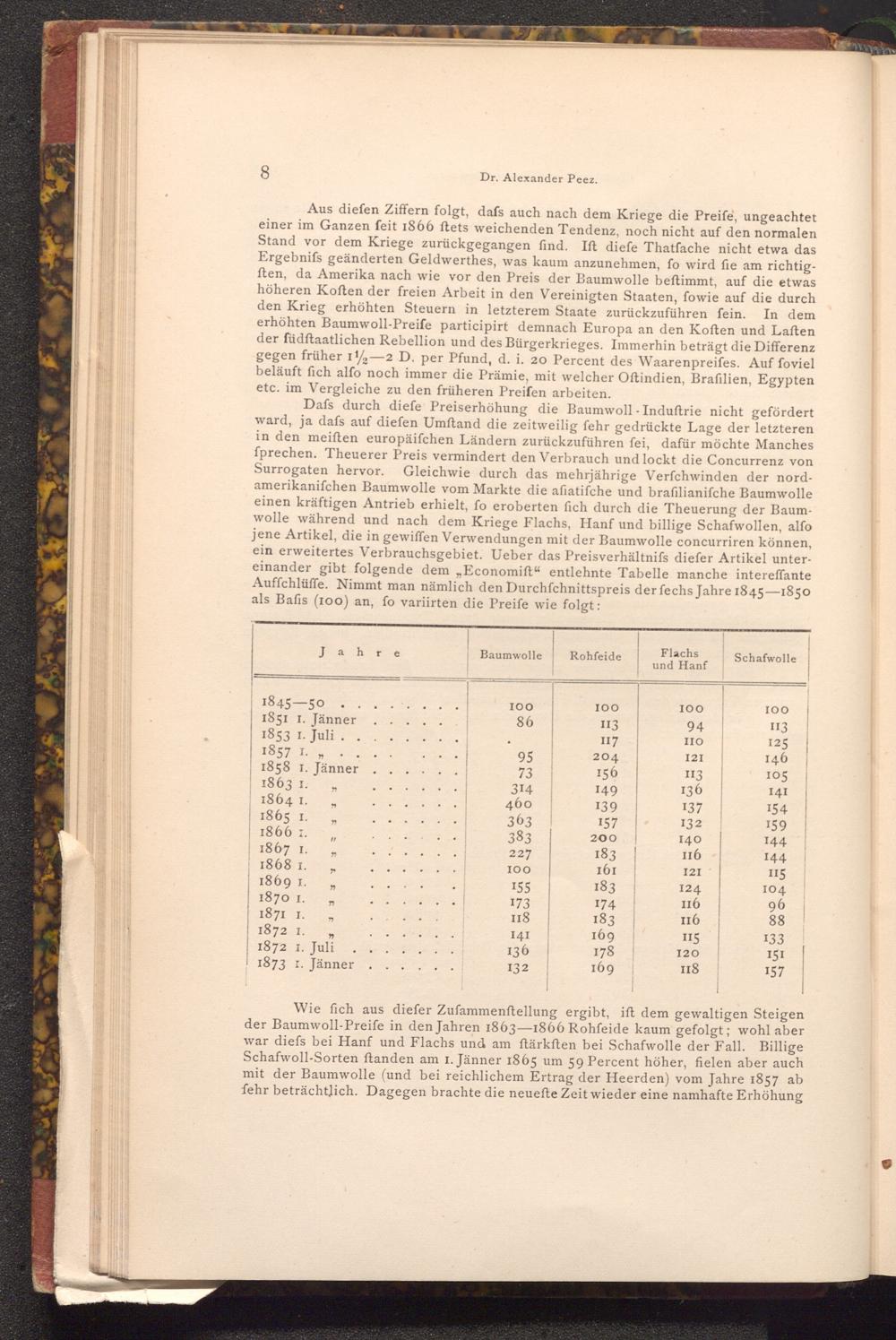 Wie fich aus diefer Zufammenftellung ergibt, ift dem gewaltigen Steigen der Baumwoll- Preife in den Jahren 1863-1866 Rohfeide kaum gefolgt; wohl aber war diefs bei Hanf und Flachs und am ftärksten bei Schafwolle der Fall. Billige Schafwoll- Sorten ftanden am 1. Jänner 1865 um 59 Percent höher, fielen aber auch mit der Baumwolle( und bei reichlichem Ertrag der Heerden) vom Jahre 1857 ab fehr beträchtlich. Dagegen brachte die neuefte Zeit wieder eine namhafte Erhöhung